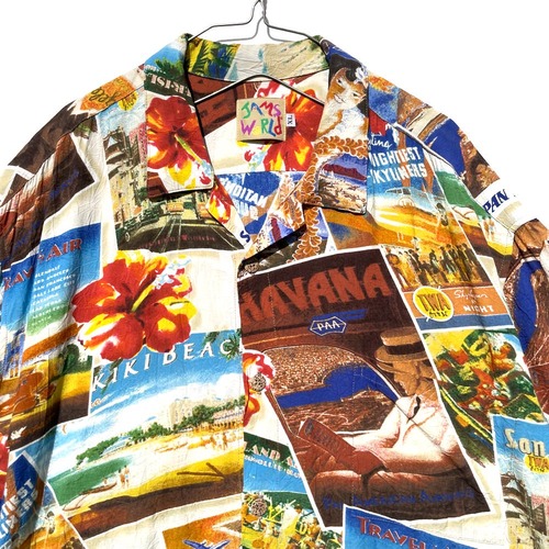 Made from 100% rayon fabric, it has a light and smooth texture with a distinctive drape, a subdued tone coloring, and a retro Hawaiian photo collage pattern.