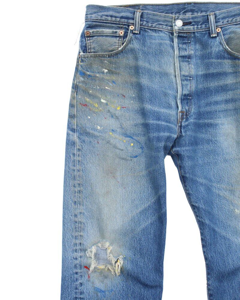LeVIS 501 denim pants. The realistic aging condition that has been used up over the years is attractive, and the paint scattered in places is also a good atmosphere. Although the age is new, it is an item that is hard to find such as the condition of the beard and the atmosphere of damage. The point is the silhouette that makes you feel comfortable wearing it because there is plenty of room in the waist. Since it is old, it rarely deteriorates over time. Please note that after checking the photo.