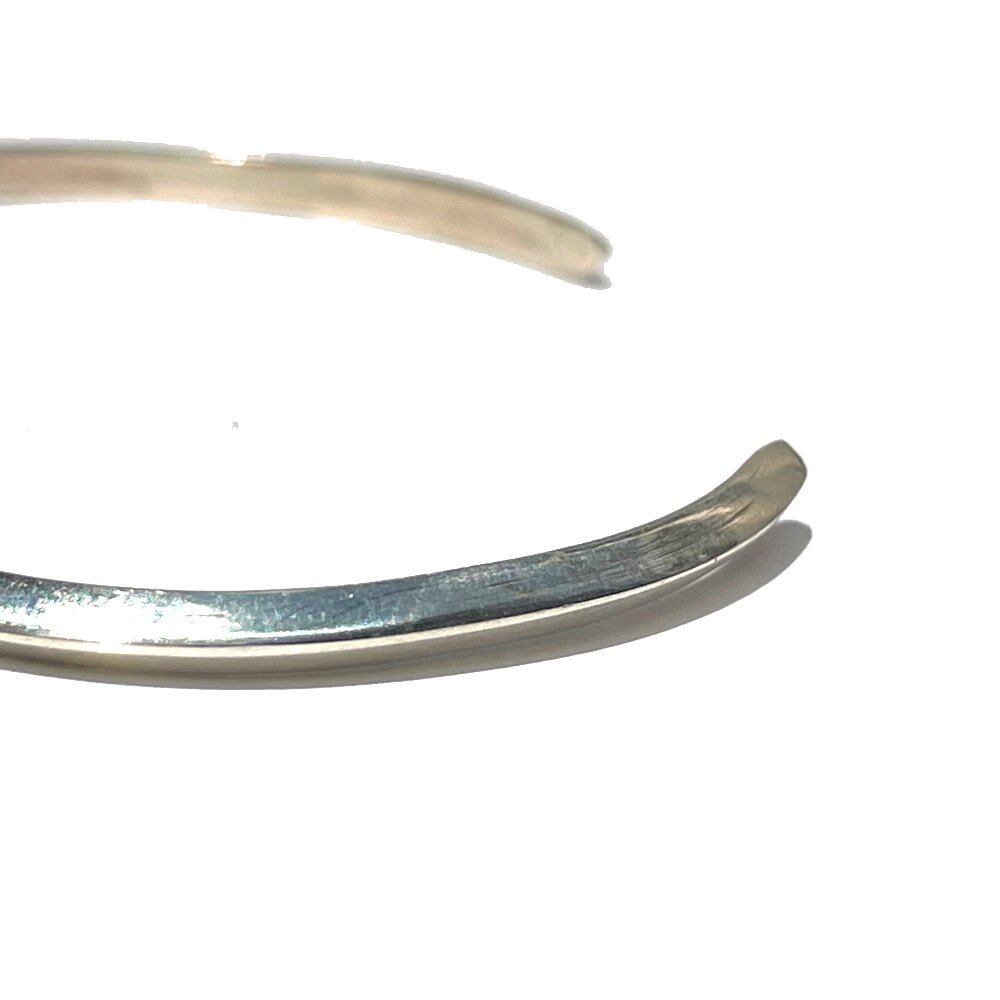 A plain type triangle silver bangle by Navajo female artist ERICKA NICOLAS BEGAY. All of her works use handmade ingot silver, giving off a presence that sets it apart from modern machine-produced Navajo jewelry, and because the plate making is also particular about handmade, there is no one that is the same. Each one is unique and unique. Inspired by the Fred Harvey style that has been around since the 1800s, her work is different from the heavy and profound Navajo jewelery, with a delicate and delicate atmosphere and a stylish yet handmade texture. This triangle type has a stylish atmosphere with a narrow silhouette and edgy edges. It has a mannish and delicate look that can be recommended not only for layering but also for women. There is no dullness due to oils and chemicals that are common in machine production, and you can feel the elegant and beautiful shine unique to handmade products, and the careful finish has the delicacy unique to women. We try to make the product photos as close to the actual colors as possible, but the colors may differ from the actual products depending on your monitor settings, room lighting, etc.
