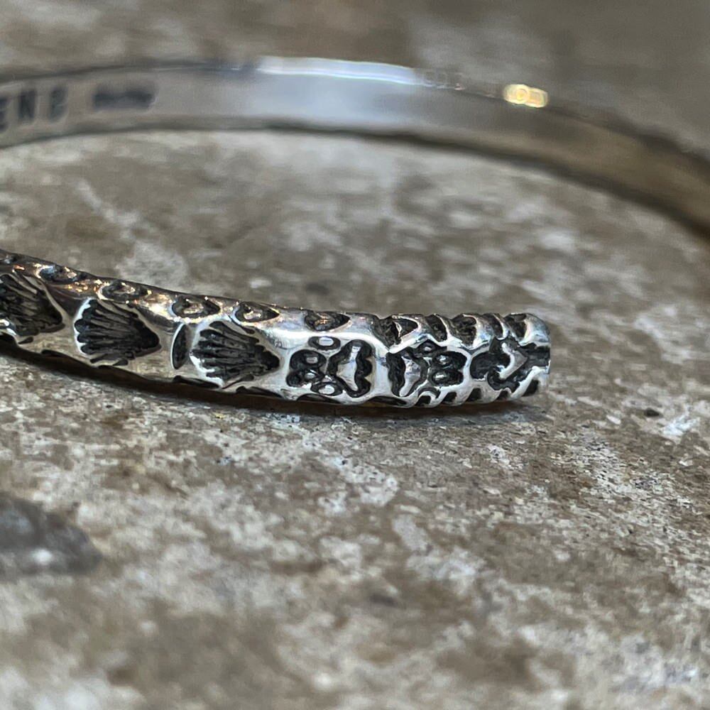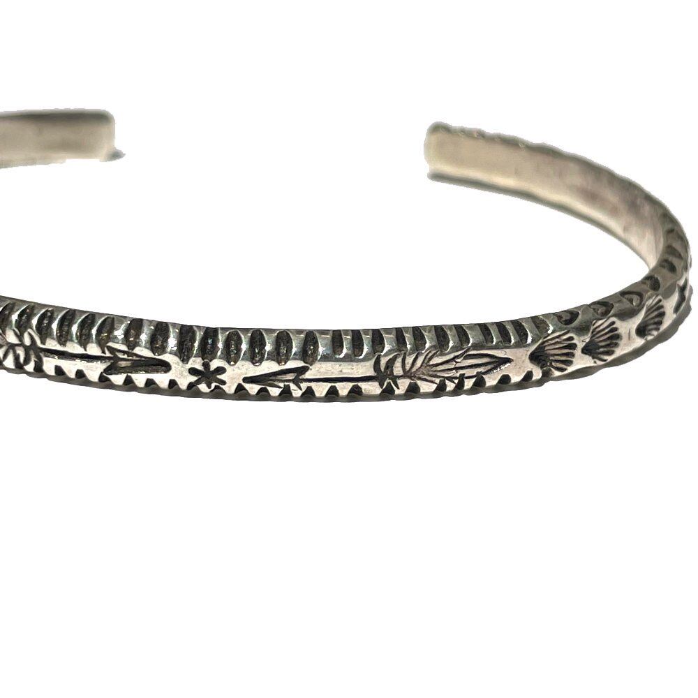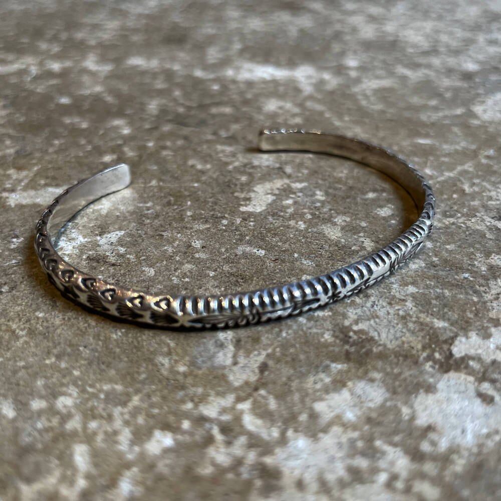 Half moon silver bangle by Navajo female artist ERICKA NICOLAS BEGAY. All of her works use handmade ingot silver, giving off a presence that sets it apart from modern machine-produced Navajo jewelry, and because the plate making is also particular about handmade, there is no one point that is the same. It is a work that makes you feel attached to it because it is a thing. Inspired by the Fred Harvey style that has been around since the 1800s, her work is different from the heavy and profound Navajo jewelery, with a delicate and delicate atmosphere and a stylish yet handmade texture. This half moon type has a narrow silhouette with a rounded and gentle atmosphere. The delicate stamp work unique to women is delicate, and the stamps of authentic Navajo jewelry such as sunlight, stars, and arrows are gently felt. There is no dullness due to oils and chemicals that are common in machine production, and the elegant and beautiful shine unique to handmade, the careful finish feels the delicacy unique to women, and it is a mannish and delicate expression that can be recommended for women as well as layering. We try to make the product photos as close to the actual colors as possible, but the colors may differ from the actual products depending on your monitor settings, room lighting, etc.