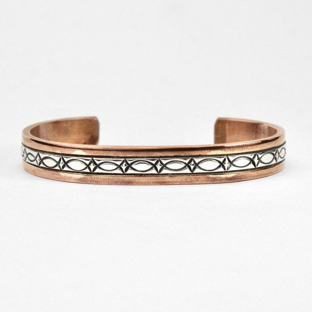Navajo bangle made of silver and copper. This combination is a rare design that does not appear much, and each contrast has an elegant look. The body has a profound feeling, and it has a stamp-like appearance, and it is simply organized as a whole, giving it a minimalist impression. It is sterling silver. Please check the condition in the photo and purchase after acknowledging the characteristics of vinteg.