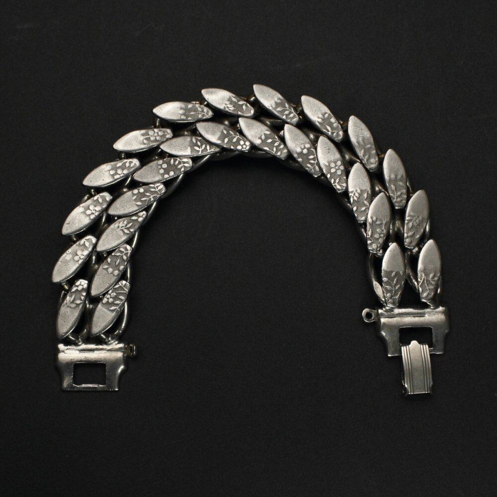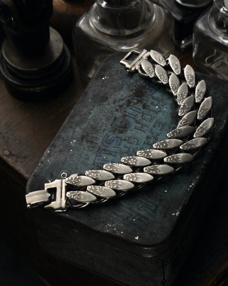 Probably a chain bracelet from the 1950s. The material is an alloy with brass, but it has a dull vintage feel and a profound feeling, and the flower pattern on the surface that has faded over time has a gap with the strict body and has an elegant look. A specification in which two curved chains are connected by a mechanism like a bellows. Since it is old, it may be scratched. Please check the photo and understand the characteristics of vintage before purchasing.