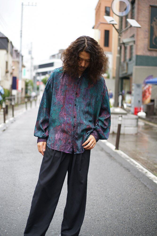 A big silhouette stand-up collar rayon shirt with a moist and soft texture.