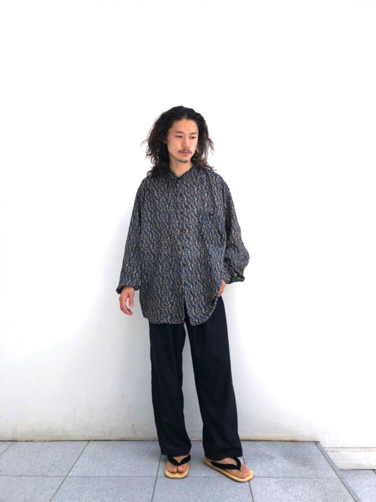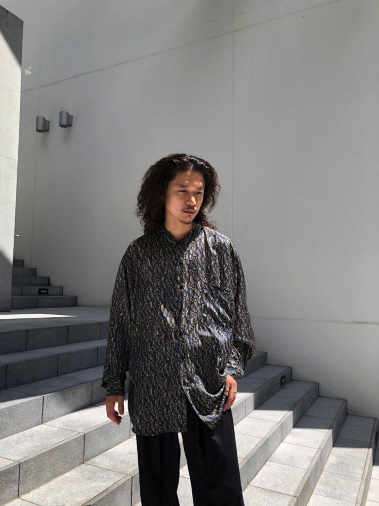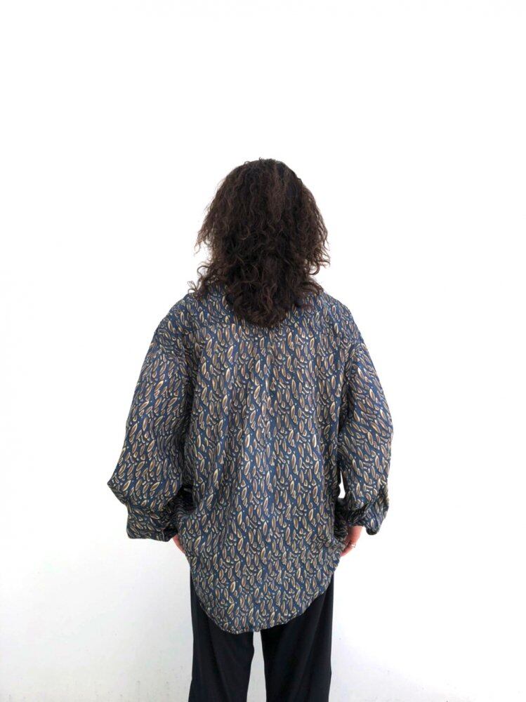 80s vintage silk shirt Moderately loose, moderate over-silhouette Band color design that makes the collar look neat One piece with a nice blue, beige, and brown leopard-like pattern A smooth and light feeling of falling in the breeze, unique to silk High-quality feel