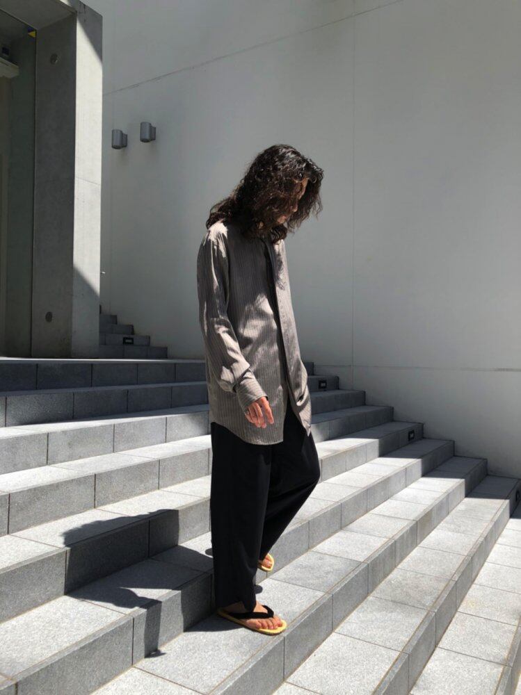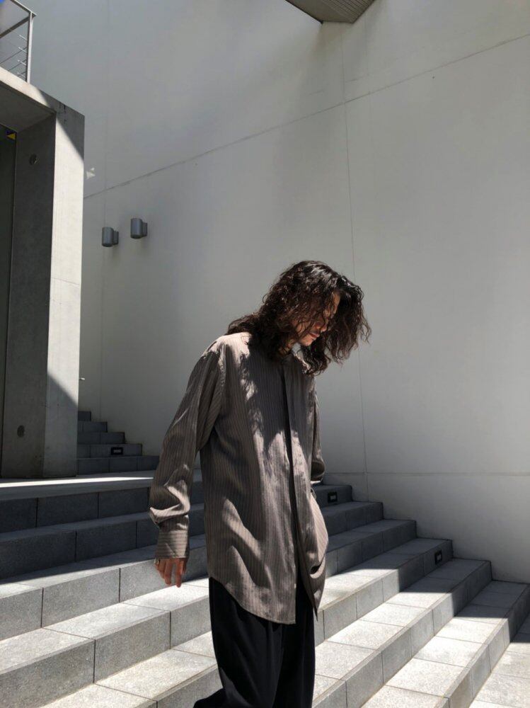 90s Donna Karans band collar shirt Astringent and mature atmosphere, calm gray striped silk x rayon soft and smooth falling feeling A relaxed silhouette with a moderately generous size
