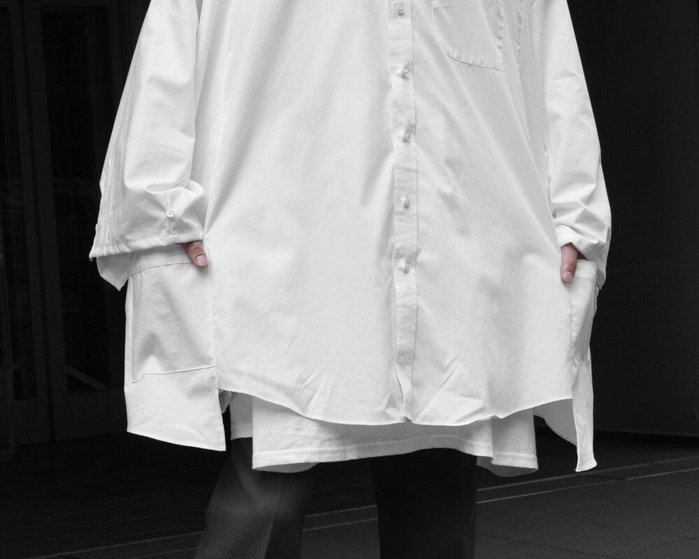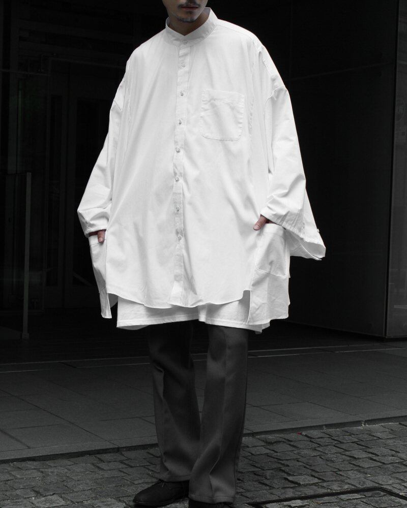 Our original pimpstick remake line The formal shirt made of cotton and polyester is disassembled and rebuilt. By using multiple panels to form a panel, it is tailored to a big silhouette, with a wider sleeve and a poncho-like image for a soft and light texture. By removing the collar and making it a band collar to make the neck area clean, the overall volume is summarized. The sleeves can be squeezed with a button and the silhouette can be adjusted. Since it is an old product, it rarely deteriorates over time. Please check the photos and understand the characteristics of vintage before purchasing.