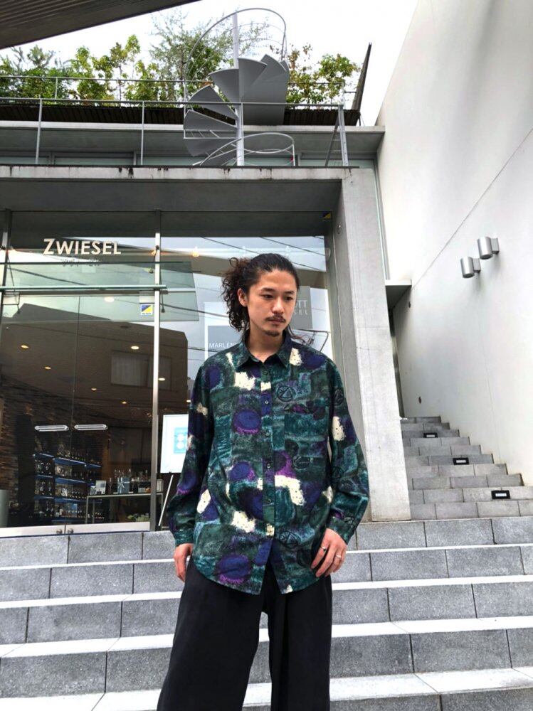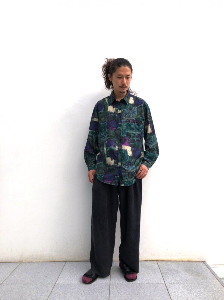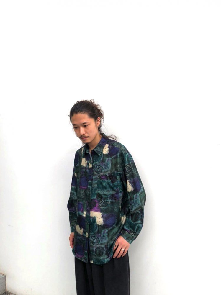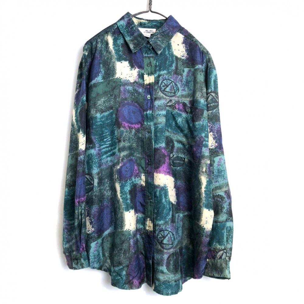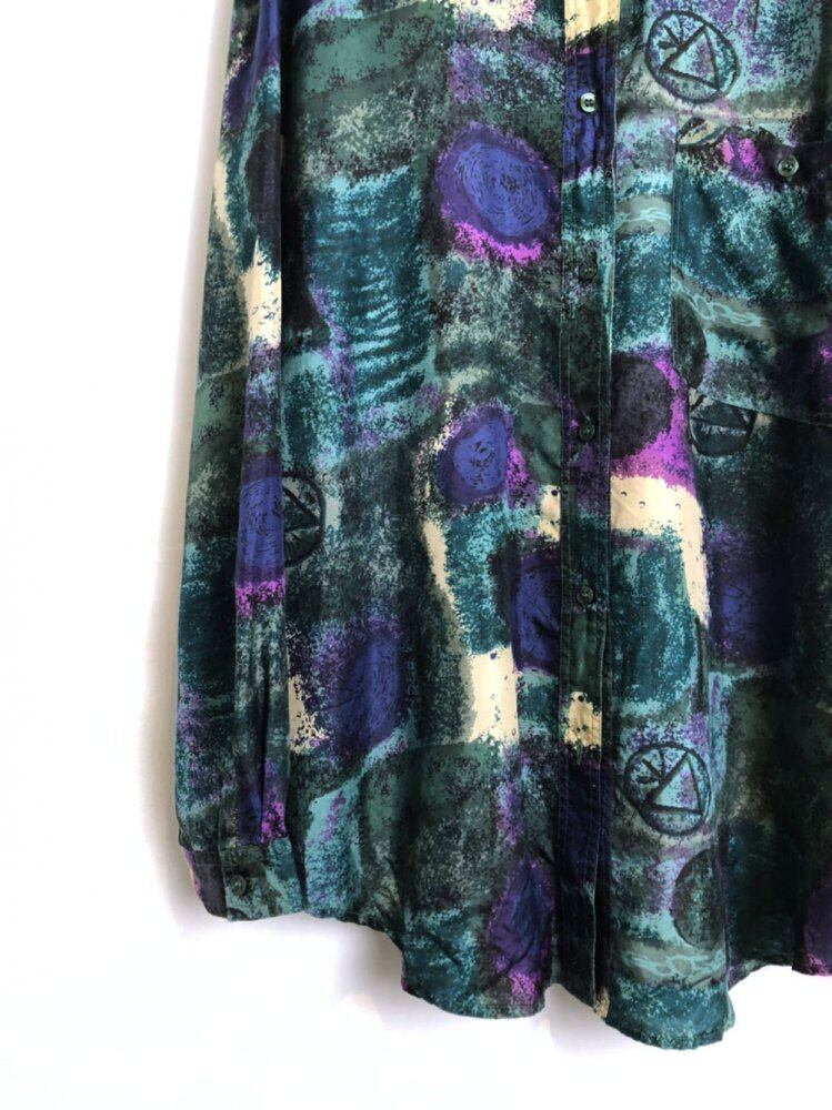 80s long sleeve silk shirt Green x purple artistic pattern with a mysterious atmosphere