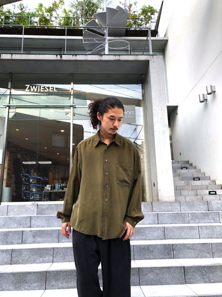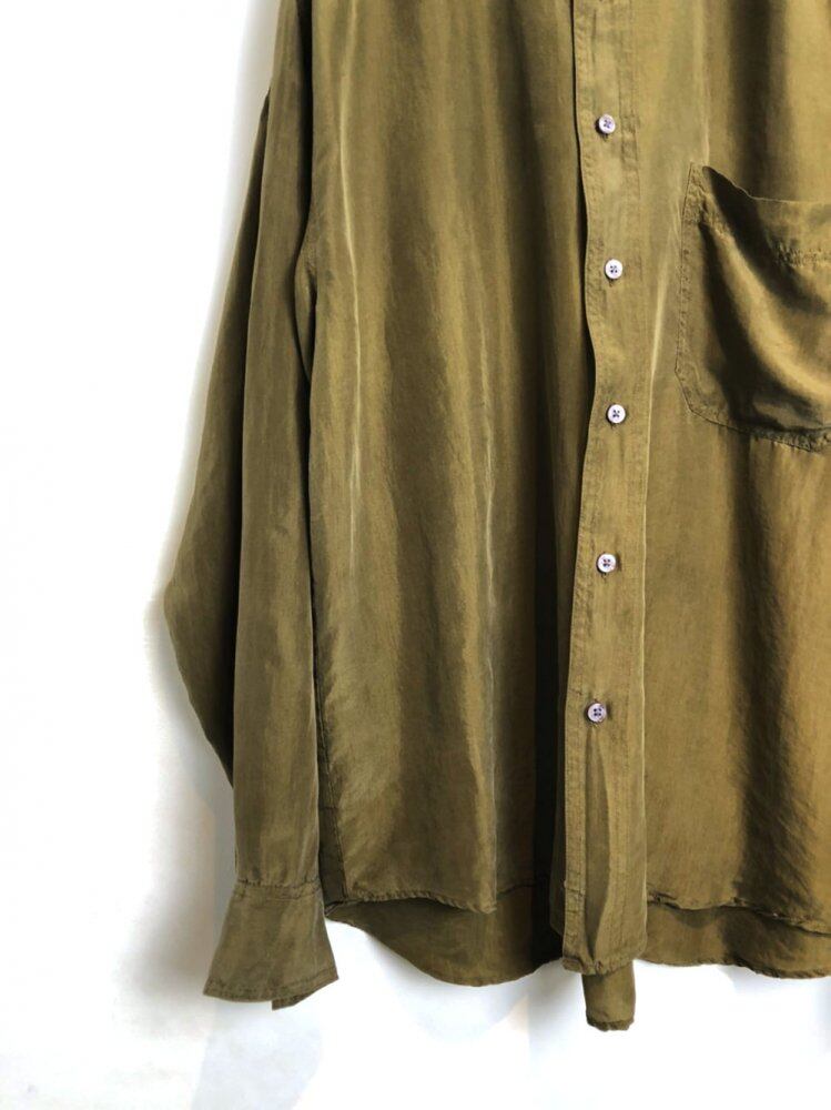 90s long-sleeved silk shirt A glossy and elegant olive-colored silk satin fabric with an adult-like atmosphere.