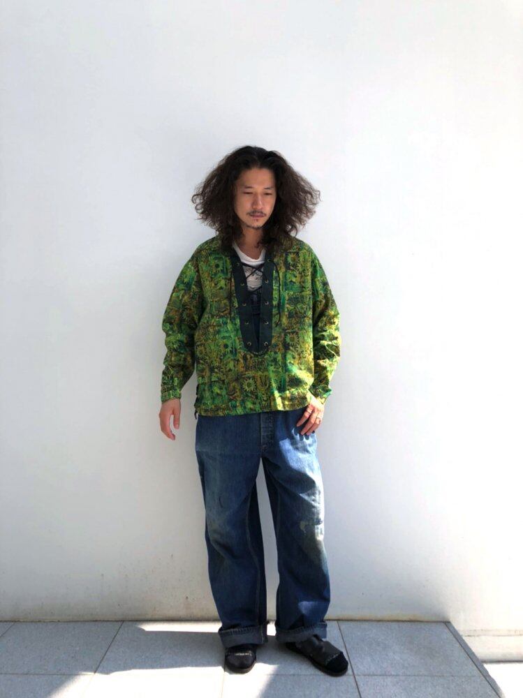 60s pullover lace-up shirt The green batik with good coloring is cute and tasty, and the pullover lace-up is a striking design. One piece of moderately light cotton is recommended for autumn haori. A good size, slightly short box silhouette