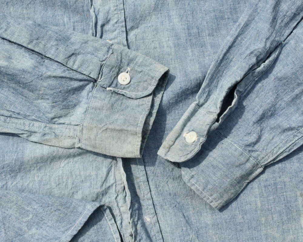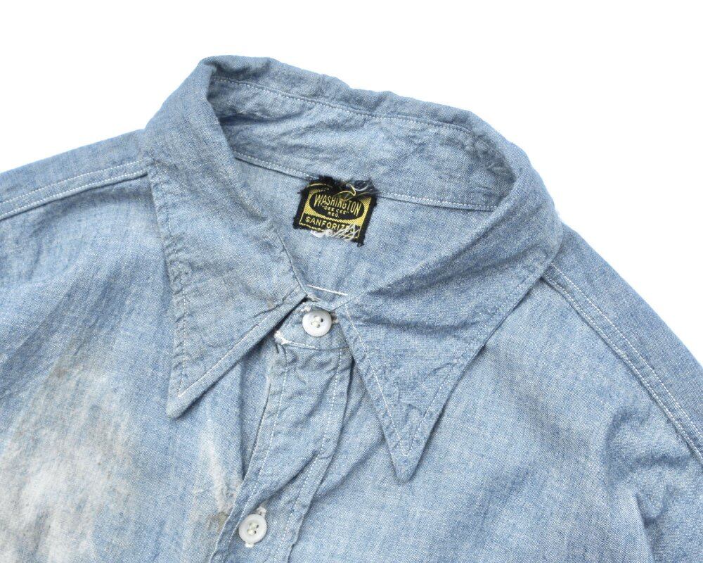 WASHINGTON DEE CEE is a work brand registered as a trademark by the Washington Manufacturing Company in 1922, and it is a classic manufacturer as a vintage, but in recent years it is a manufacturer that rarely sees individuals. This is a denim chambray shirt from the 1960s. The solid 100% cotton fabric has a vintage feel and is a rare piece in recent years with a gusset that can only be seen until this age. It is an individual with a realistic work feeling and aging condition that gives a more vintage feel. Although the size notation is missing, it is probably a loose silhouette with a feeling of size of 16 or more. Since it is an old product, it rarely deteriorates over time. Please check the photo and purchase after acknowledging the characteristics of vintage.