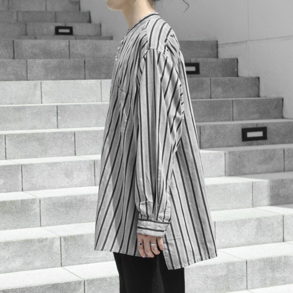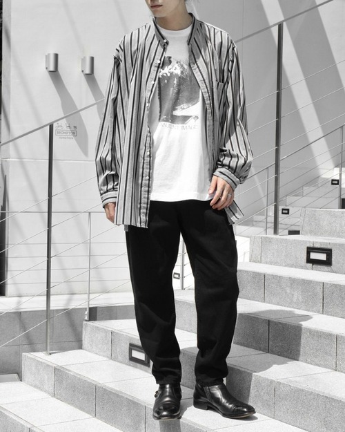 Our original pimpstick remake line dress shirt. A remake of a shirt made from light cotton / polyester fabric from the 1980s. The wide stripe pattern that seems to be this age has a solid look. In consideration of the overall balance, the cuffs are cut short, the collar is removed, and the collar is made thinner to give a neat impression around the neck. It is a utility item that can be worn as a haori like a cardigan. We have calculated a relaxed silhouette and dared to choose a body with a big silhouette. Since we are remaking old clothes, there are rare cases of deterioration over time. Please check the photo and understand the characteristics of Vintage before purchasing.