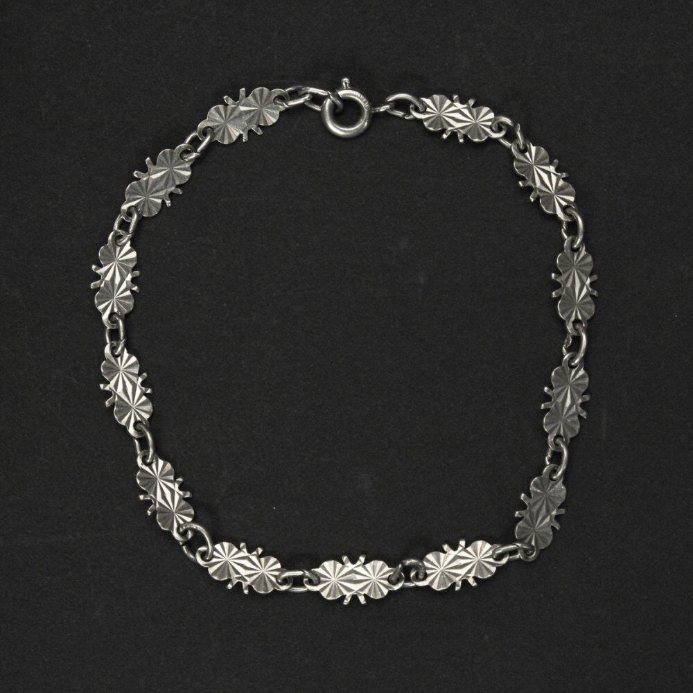 A chain bracelet with a series of sun-like designs. The cutting that looks like a flower or a butterfly and shines casually is an elegant expression. It is an individual that can be worn by both men and women with a narrow silhouette. It is sterling silver with dullness, probably from the 1960s from the STERLING engraving and design. Since it is old, it may be scratched. Please check the photo and understand the characteristics of vintage before purchasing.