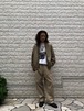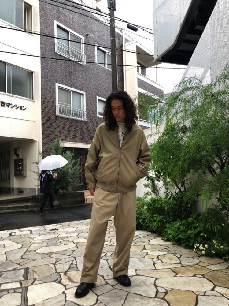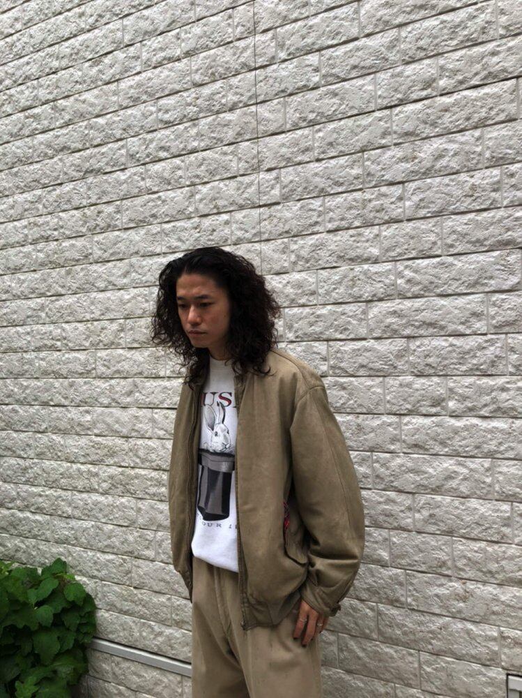80s leather jacket A khaki beige color with a nice texture of leather that has become loose over time. The lining is a bright red tartan check. A moderately spacious and well-balanced size.