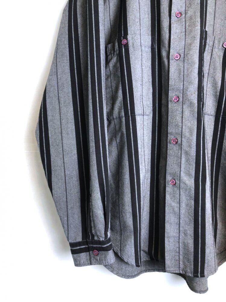 90s band collar shirt Gray x black striped pattern with gray solid back panel design is interesting 1st place polyester x cotton smooth and soft fabric Shirt with a relaxed silhouette that feels comfortable and relaxed