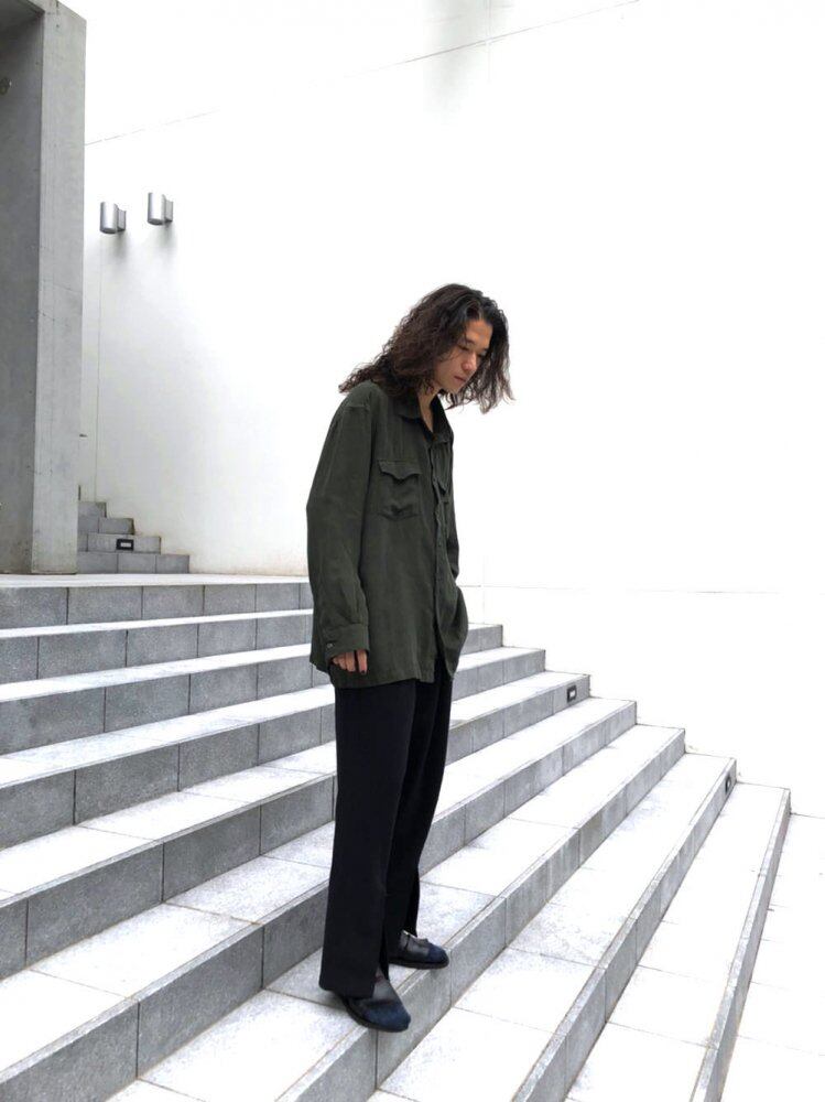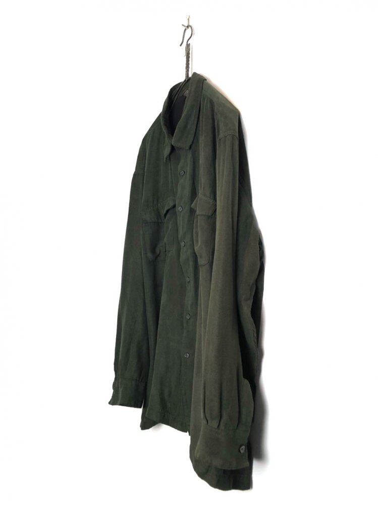 90s peach skin shirt Peach skin cloth with a smooth and soft brushed feel. Olive color with a bitter and masculine atmosphere. A loose and voluminous box silhouette is easy to match and easy to use.