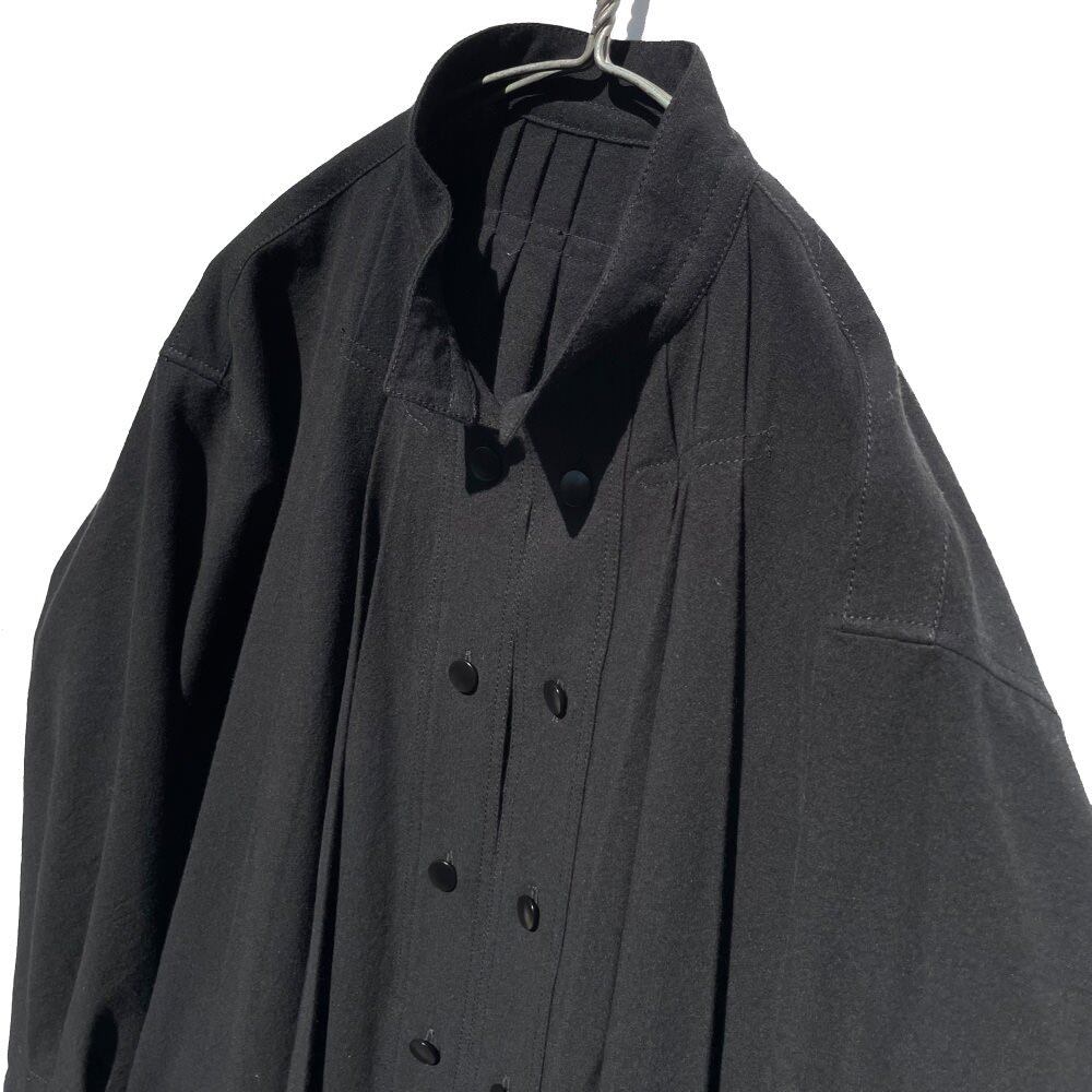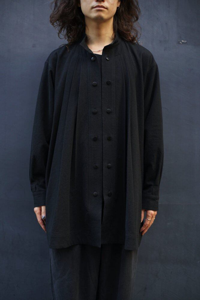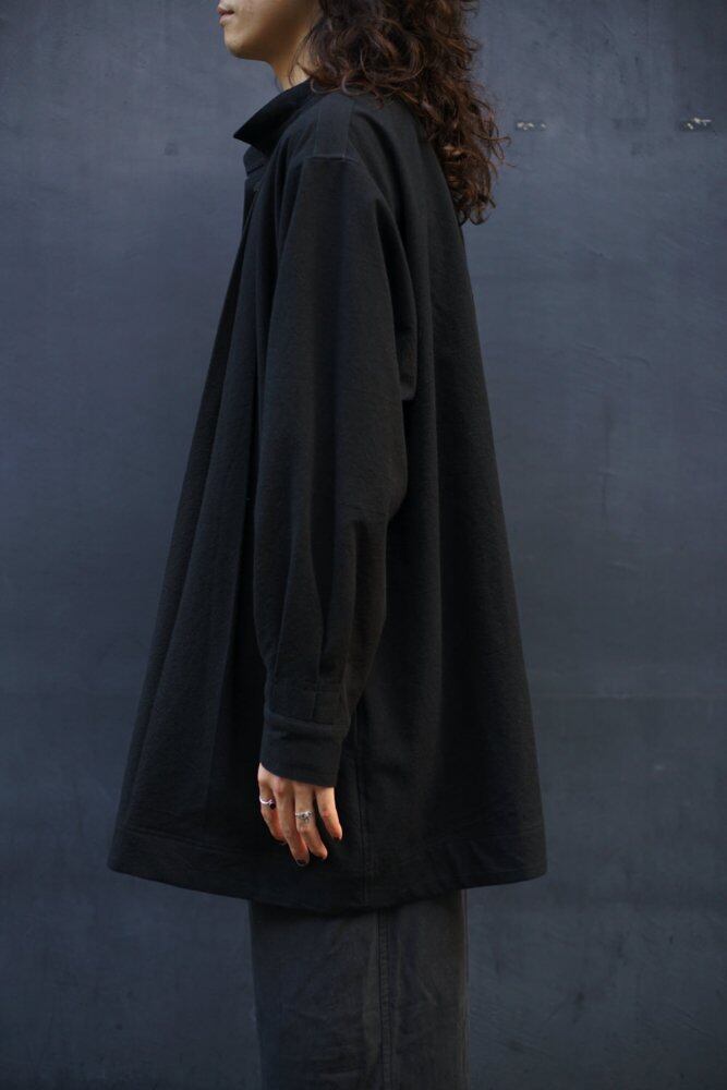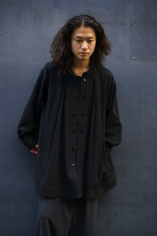 [ALVISTA] 3rd issue Vol 3. The motif is a work smock that was made in France in the early 20th century using a material called doge (a cheap cloth made by mixing wool with cotton and linen). A middle-length shirt featuring a unique A-line silhouette like a church smock that spreads from the collar to the hem with a tuck on the front and back collar to take a large amount. The button uses this nut button made from the body of Tagua palm. [Cotton linen wool canvas antique die] A canvas material that uses cotton for the warp yarn and linen / wool blended yarn for the weft yarn. A fabric dyed with a special dyeing Higashi-cooking that incorporates a technique called putting that was performed in the Edo period. In modern times, the technique is to use a cauldron, which is rarely used due to poor productivity, mix lime and vegetable lye, and dye it by hand without relying on machines as much as possible. In the process of slowly dyeing the fabric, the fabric is picked up with lime, etc., giving it a texture that makes the most of the original texture of the fabric. The material itself is made of cotton, linen, wool and threads with different shrinkage ratios, and the difference in shrinkage ratio is also a material with a unique surface feeling. Small lots, hand dyeing and Due to drying, large and small wrinkles and some uneven dyeing may appear on the fabric, but it is not counted as a defect because it is a characteristic of processing.