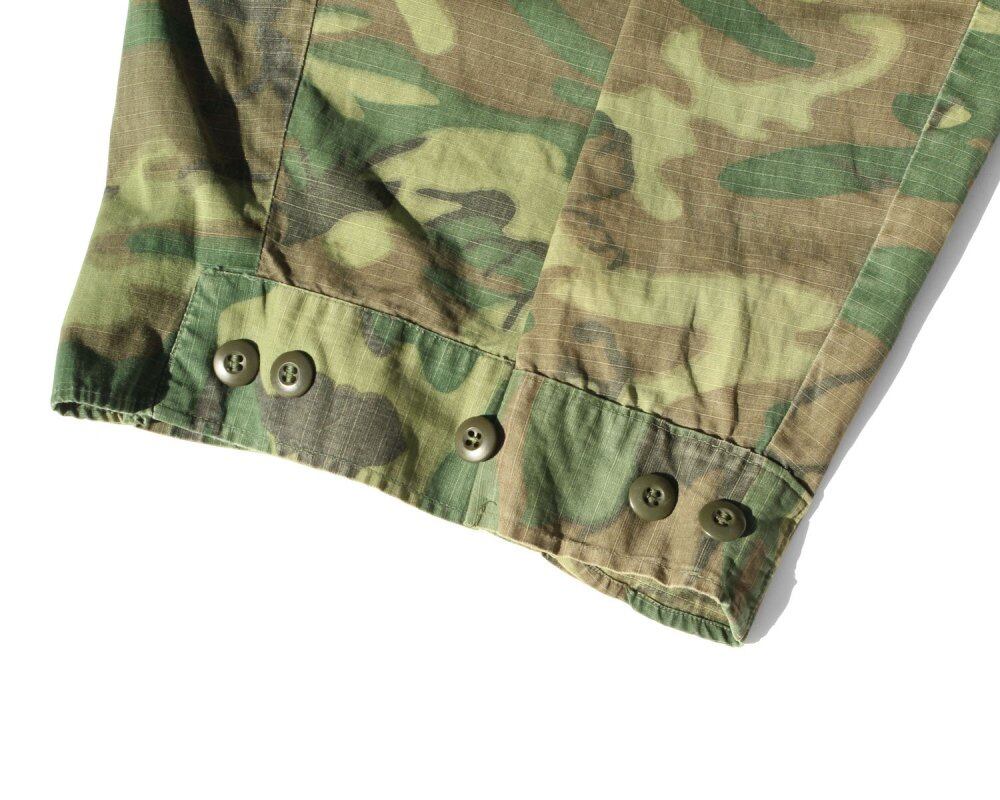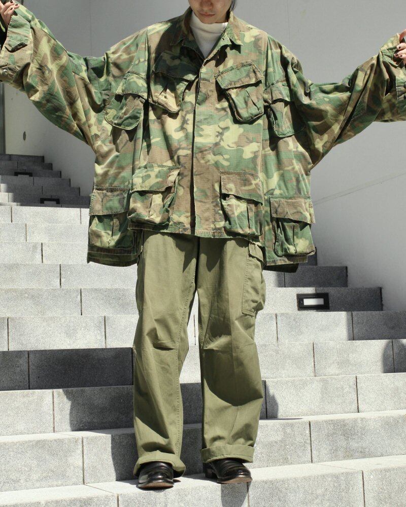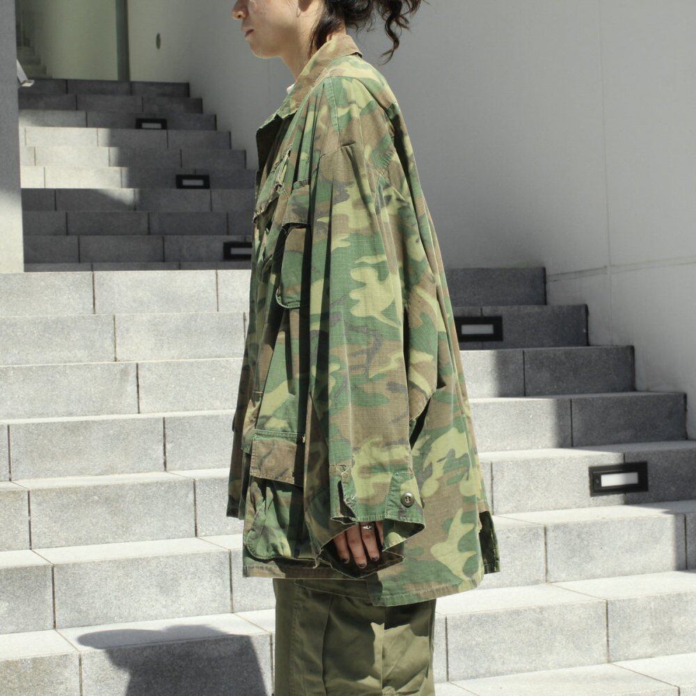 Our original pimpstick remake line The vintage BDU jacket of US military cotton ripstop fabric is disassembled and rebuilt. By using multiple panels to create a panel shape, we have created a big silhouette with a wider sleeve and a poncho-like image for a more voluminous feel. The cuffs are tailored so that the silhouette can be changed using multiple buttons. It is a new remake that leaves an impact when worn as a single piece, not to mention layered. There is damage etc. because it uses vintage. Please check the photo and understand the characteristics of vintage before purchasing.