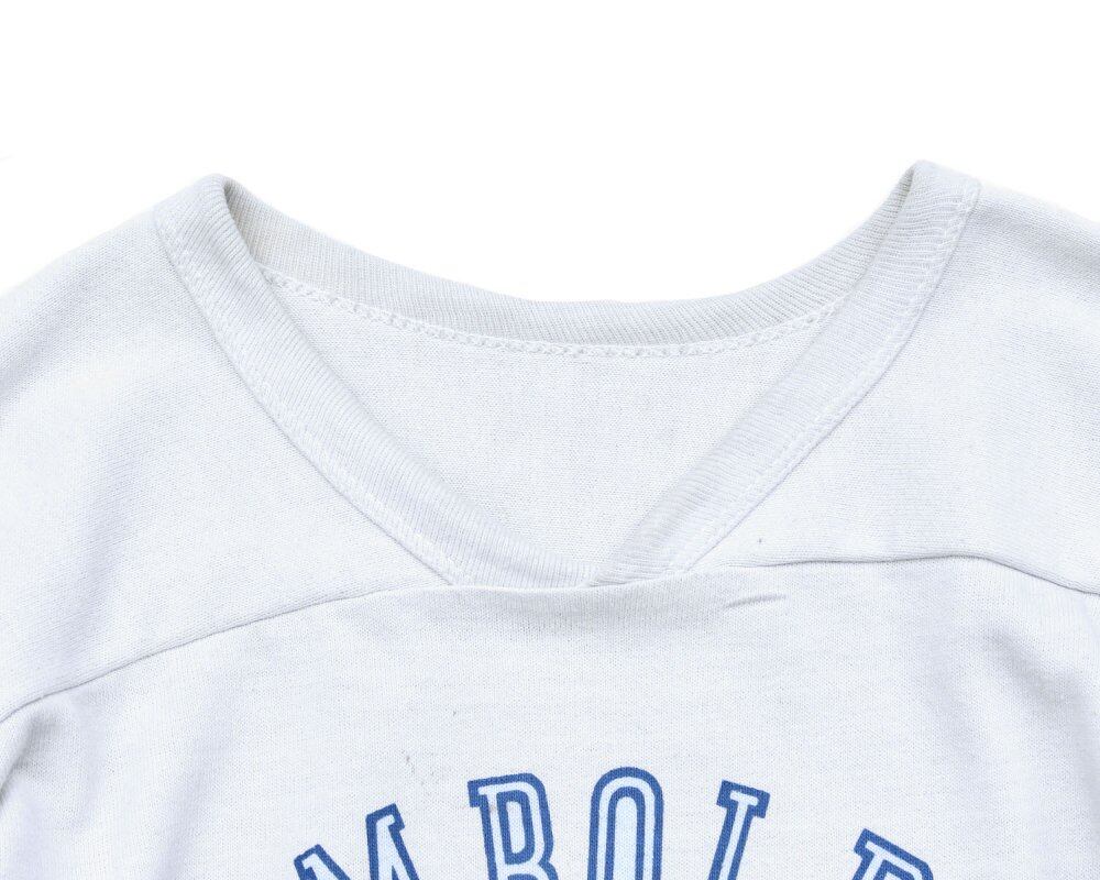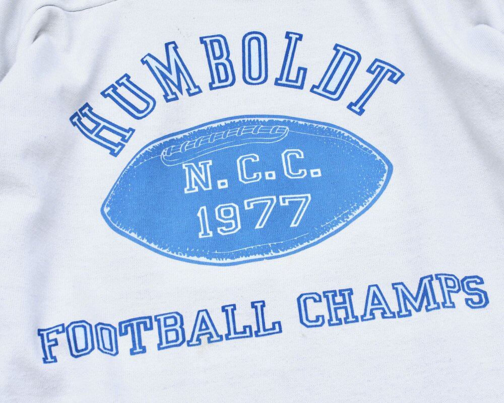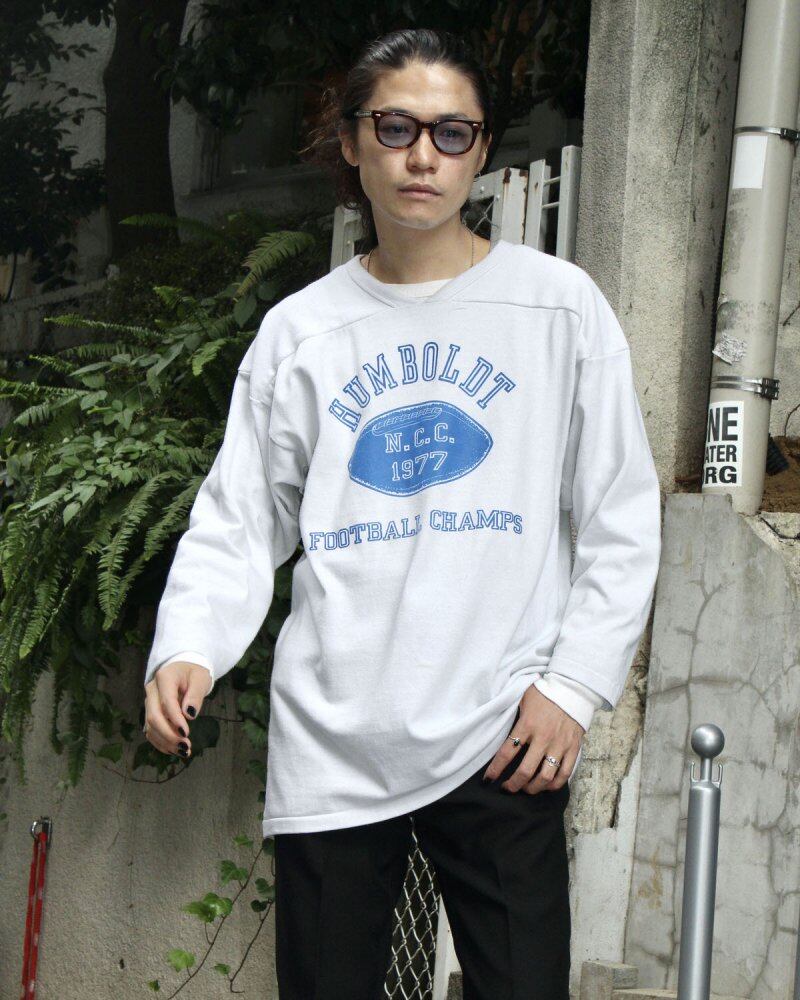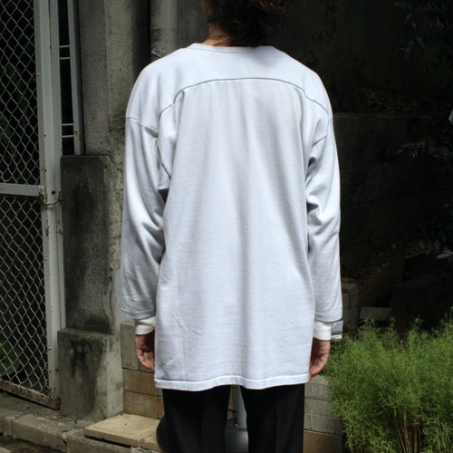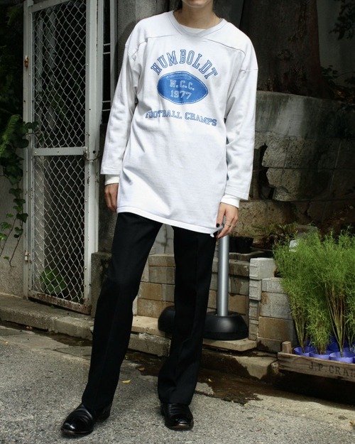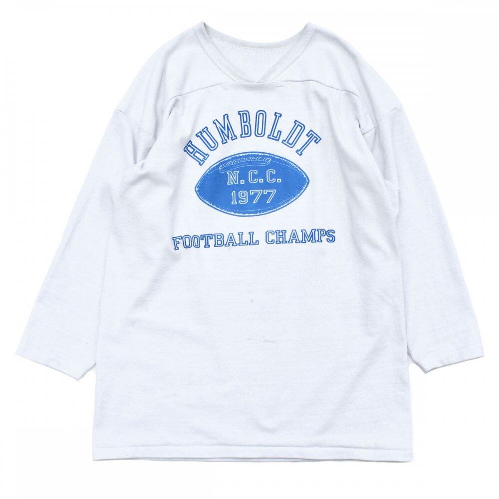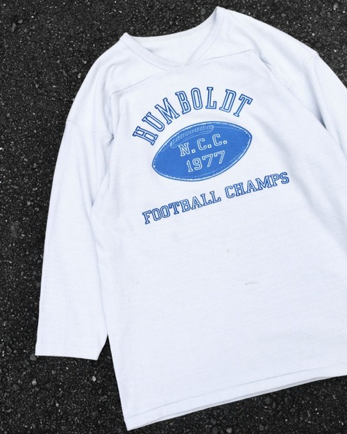 Russells American football T-shirt from the hem tag and construction. The cotton / polyester medium-weight fabric has a vintage-like natural texture. A three-quarter sleeve type that is hard to find in recent years. Probably L size or larger and a valuable silhouette with plenty of space. The slightly bluish grayish color is a unique look. It is dirty in some places and is in good condition subjectively as used clothing. Since it is an old product, it rarely deteriorates over time. Please check the photo and understand the characteristics of Vintage before purchasing.