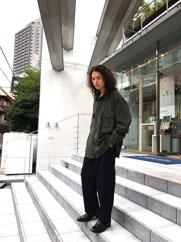 90s Wranglers Peach Skin Shirt Peach Skin Cloth with a smooth brushed feel and a well-balanced over-silhouette with a relaxed volume Olive color with an adult atmosphere
