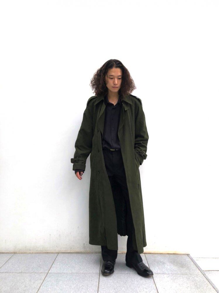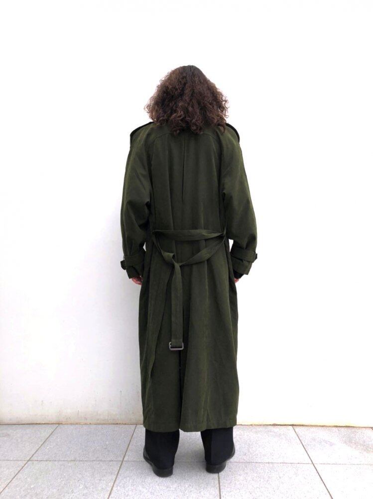 90s Peach Skin Trench Coat Peach Skin Cloth with a smooth brushed feel The olive color has a mature and calm atmosphere, which is more elegant than the olive color of military items. silhouette