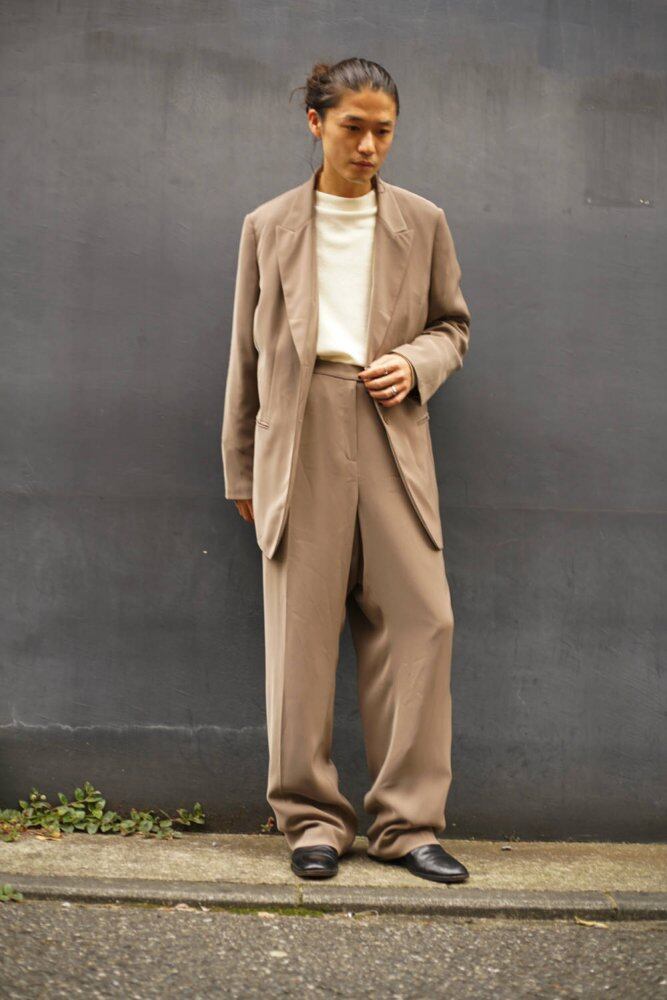The moderately tight details of the semi-peak lapel and the mannish box silhouette enhance the drape of the soft and wavy fabric, giving a soft impression.