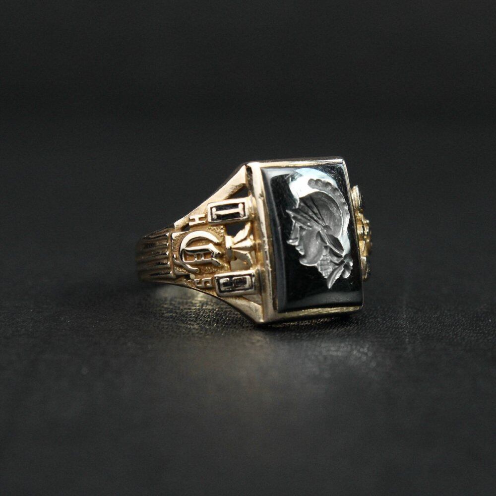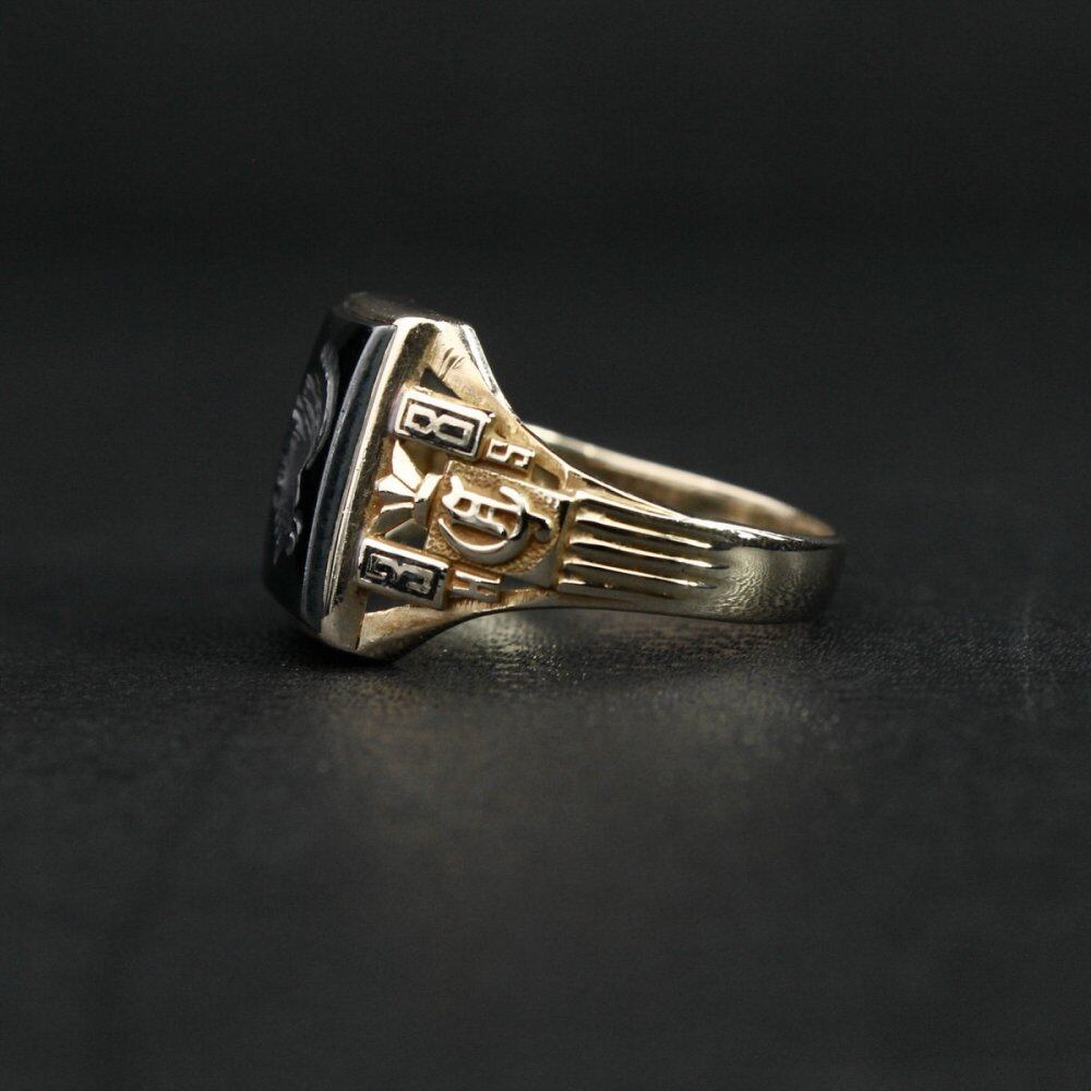 1938 vintage class ring. From the First World War to the late 20s and 30s, which was hit by the Great Depression, the college ring of this age is often made of silver or brass, and gold individuals are rarely seen. This is a very rare individual with a cameo on the top that I have never seen before. The side engraving and openwork are elegantly constructed with the taste of Art Deco, and the top is made of hematite (iron ore), which is often used for mens cameo rings, and has a mannish look that is not too feminine. The class ring of this age shows more remnants of the signet ring, which also shows the elegance of the signet ring. Long-established HERFF JONES 10kt gold engraving. Please check the condition in the photo and purchase after acknowledging the characteristics of vinteg.