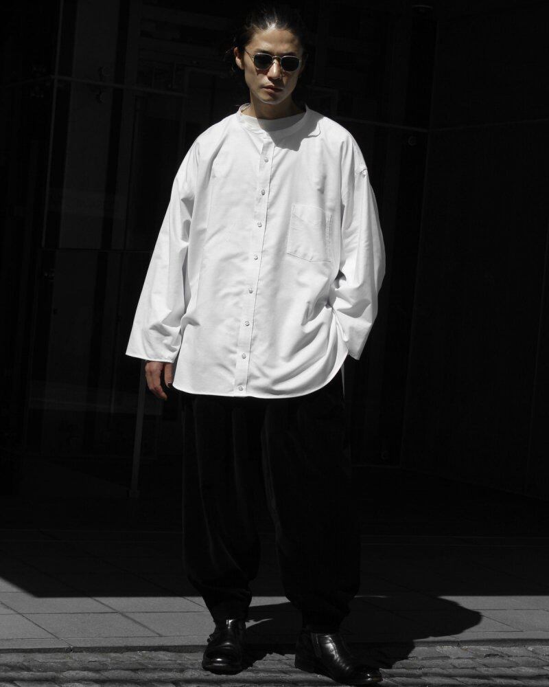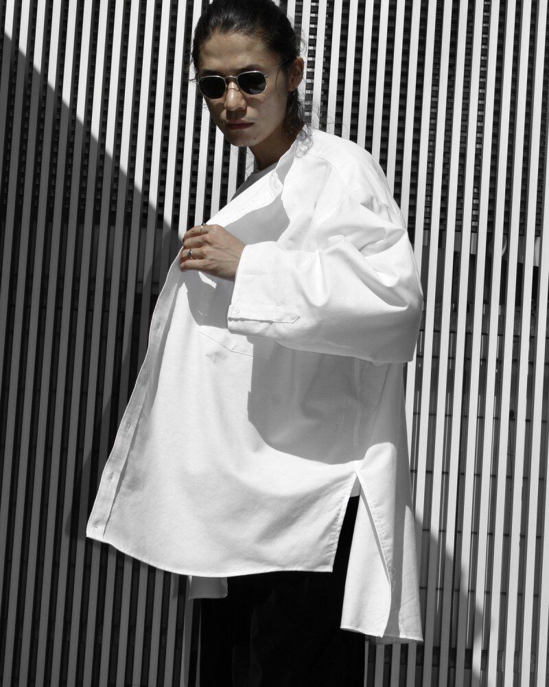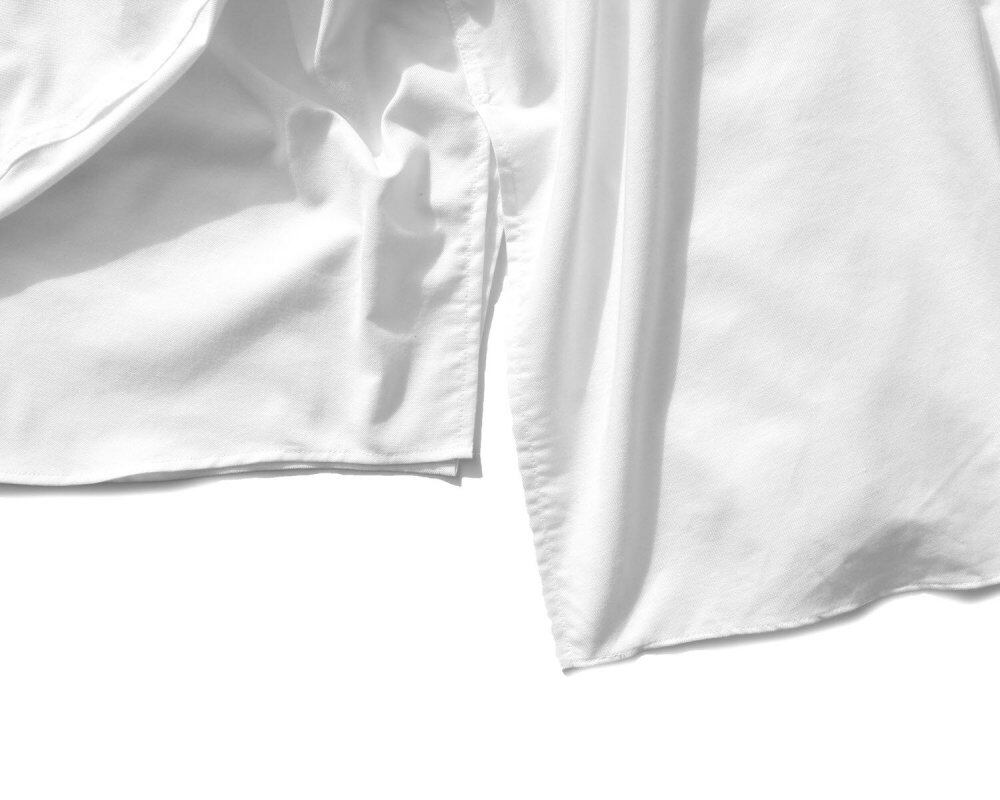 Our original pimpstick remake line dress shirt. A formal shirt made of cotton / polyester fabric that has both softness and firmness is remade on the body. An all-white color with a calm look while showing a solid feel. The collar is removed and the collar is made thinner to give a neat impression around the neck. Considering the overall balance, the sleeve length is shortened and the cuffs are removed to create a silhouette like a wide sleeve. While taking advantage of the original long length, slits are provided on the side seams to give a feeling of lacking. It is a utility item that can be worn as a haori like a cardigan. We have calculated a relaxed silhouette and dared to choose a body with a big silhouette. Since we are remaking old clothes, there are rare cases of deterioration over time. Please check the photo and understand the characteristics of Vintage before purchasing.