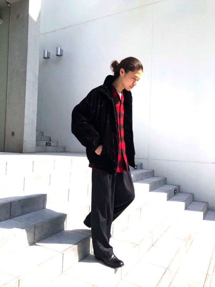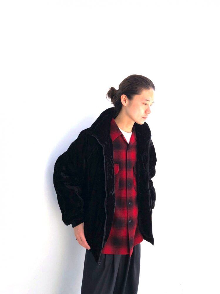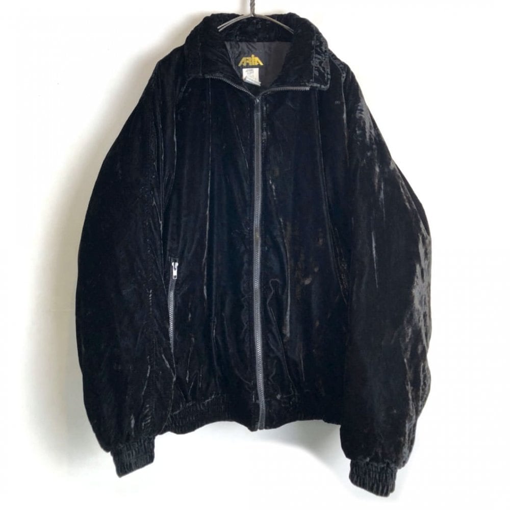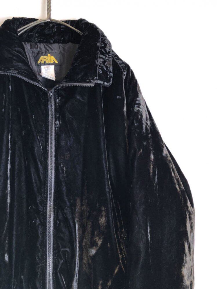 80s Bomber Jacket A luxurious black velvet with batting for a voluminous look. Contrary to the voluminous appearance, this jacket is light and easy to move. A sporty velvet outer with a loose over-silhouette and a good size balance.