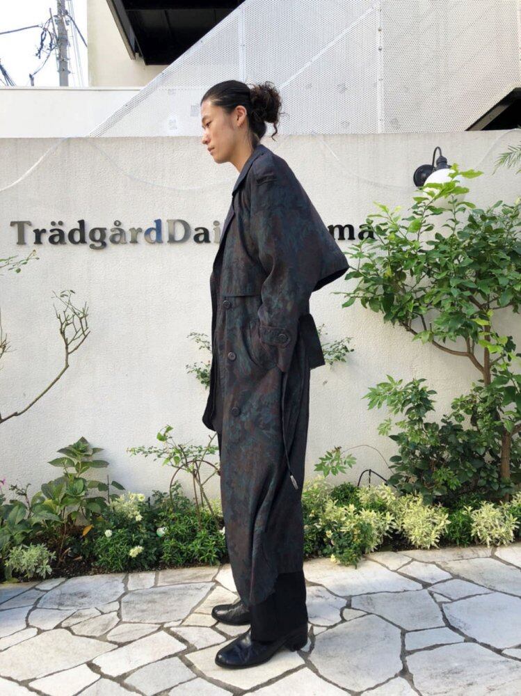 A dark green botanical pattern with a light texture of 100% nylon that can be used in a wide range of seasons. A powerful long silhouette. With a removable liner, it can also be used as a spring coat.