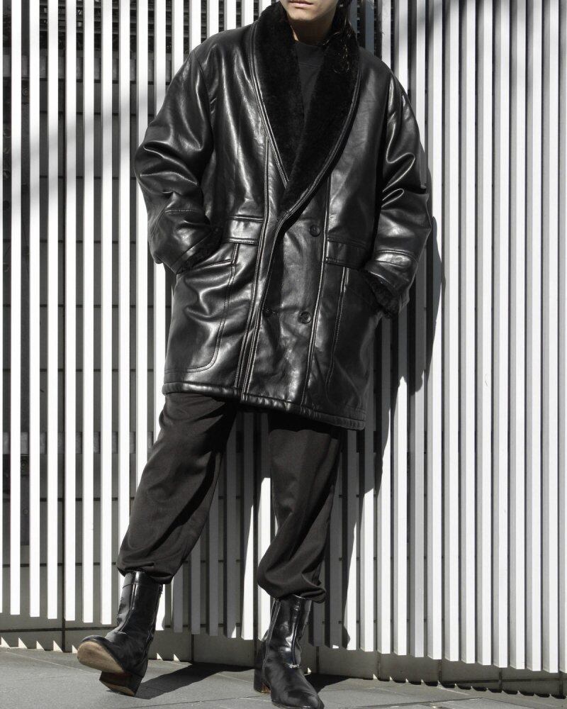 The faux leather fabric made of cotton / PVC (synthetic rubber) / urethane has a soft texture like lambskin and features a realistic surface feeling. The double-breasted, shawl-colored car coat-like design is all black, including the bore, giving it a sensual appearance. A relaxed silhouette with a beautiful feeling of falling due to the softness of the fabric while being relaxed as a whole. It is in good condition subjectively. Since it is an old product, it rarely deteriorates over time. Please check the photo and understand the characteristics of vintage before purchasing.