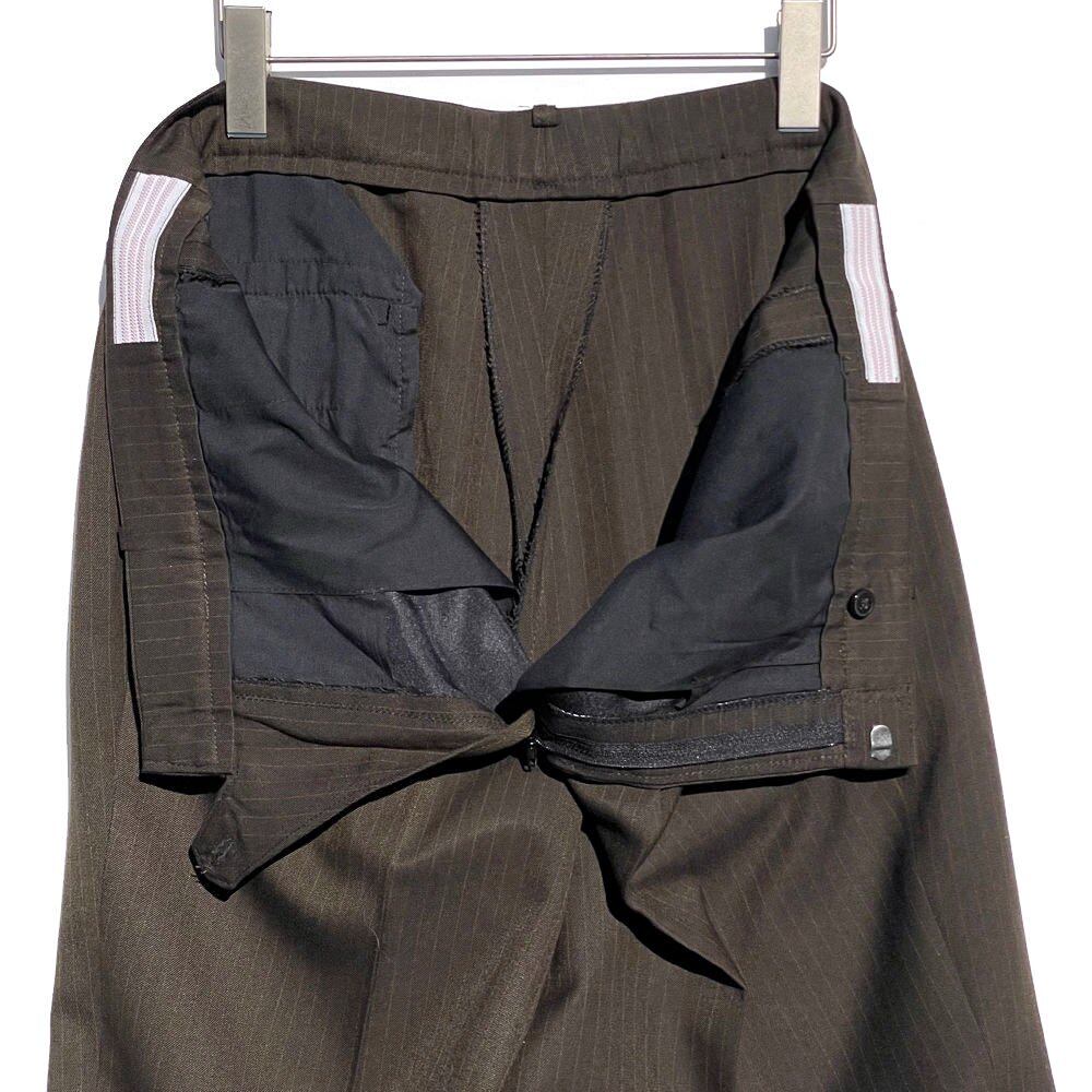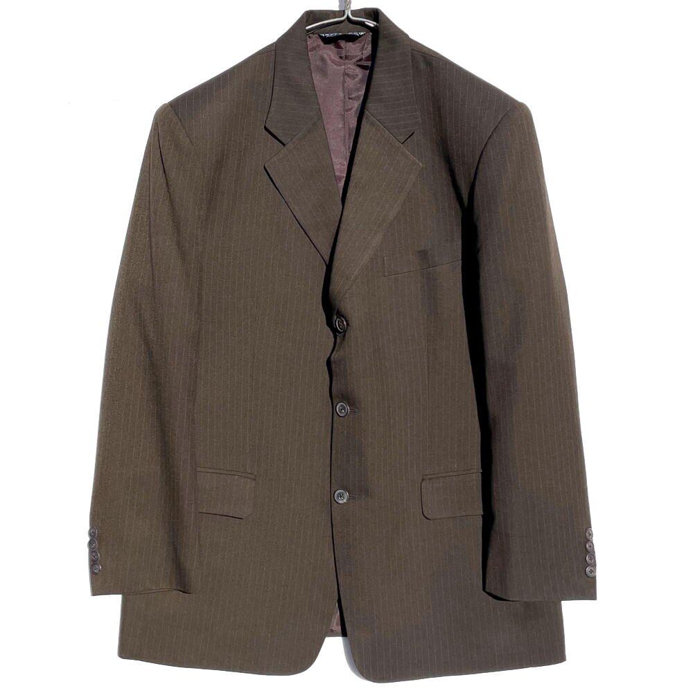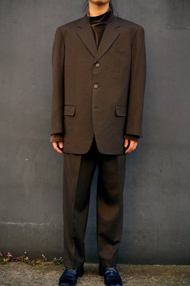 Yellow pinstripe running on the brown body, a box silhouette without a vent with a profound feeling of 3 buttons, a soft line along the shoulder while retaining the mannish of the time, the pants are a straight silhouette with 2 tacks and an American classic look ..