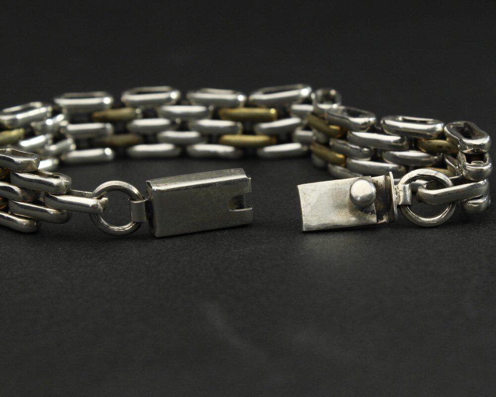 Made in Taxco, Mexico, one of the worlds leading silver mining sites, where many silver artists and craftsmen have gathered since ancient times. From the native Aztecs to the Indian jewelery-like designs that show the influence of the American Southwestern, this vintage has been the focus of attention in recent years, with sophisticated minimalist designs. This is a caterpillar-like design with a fit that looks like a watch band. Brass is used between them, giving it an elegant contrast. It has a heavy weight and is characterized by a minimal and elegant appearance. Since it is old, it may be scratched, so please check the photo and understand the characteristics of vintage before purchasing.