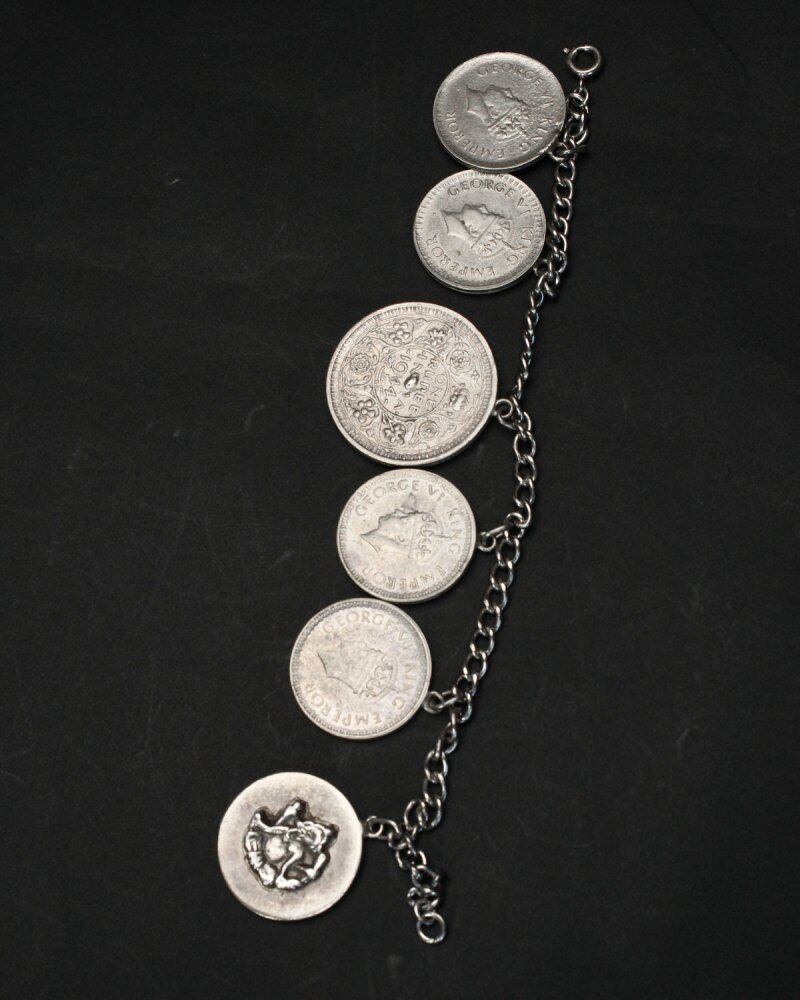 A charm bracelet with 1944 Indian coins. Rhythmic construction without using the same size, Ganesha-designed coins also enhance the atmosphere. Ganesha coins and body chains are sterling silver. Since it is old, it may be scratched, so please check the photo and understand the characteristics of vintage before purchasing.