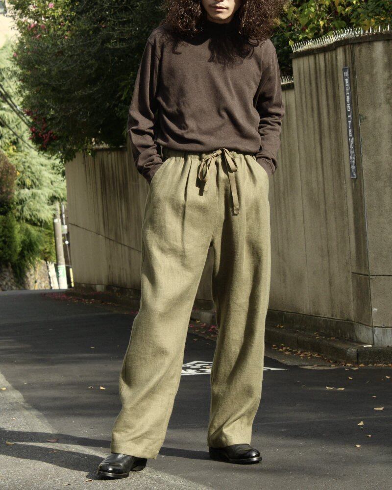 [ALVISTA] 4th Issue. Sleeping pants made simply using the brands archive stock fabric. The waist is made of rubber shirring and drawcord easy pants. The tapered silhouette with a moderate amount of space throughout makes it very easy to wear with a versatile FREE size setting regardless of the wearers body shape or style. The medium-sized dough has a firm feel, yet has a fluffy surface and is comfortable and has a natural linen-specific character.