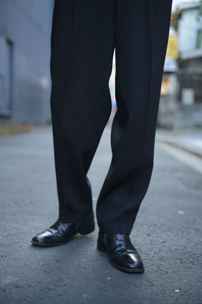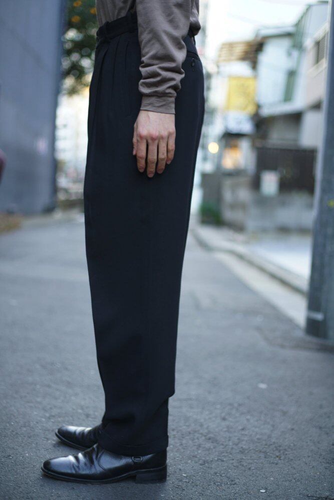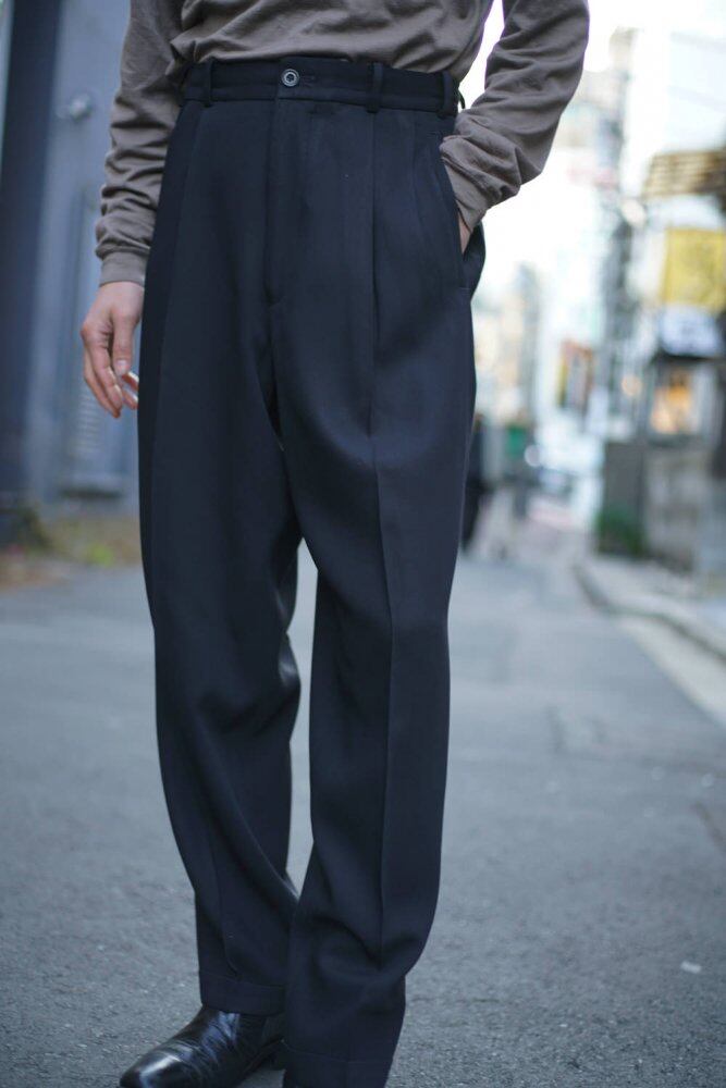Two-tuck trouser pants with a comfortable wool rayon fabric that is characterized by a soft and supple texture.