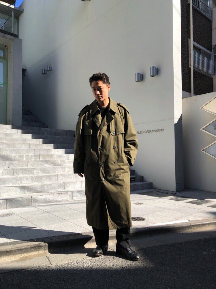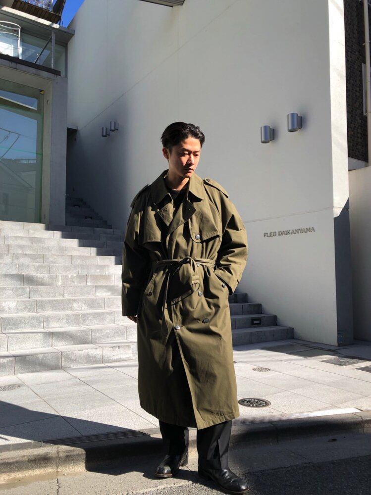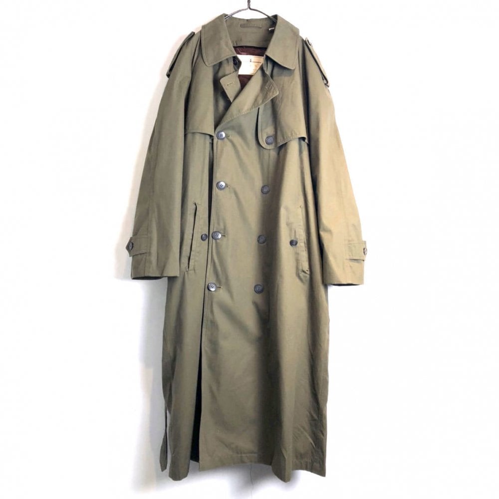 90s peach skin coat Vintage trench coat of peach skin cloth with a smooth texture with a brushed feeling Vertically long i-line, moderately loose and well-balanced over-silhouette coat With a removable liner, it can also be used as a spring coat 1 Light olive color that feels good in a mature atmosphere
