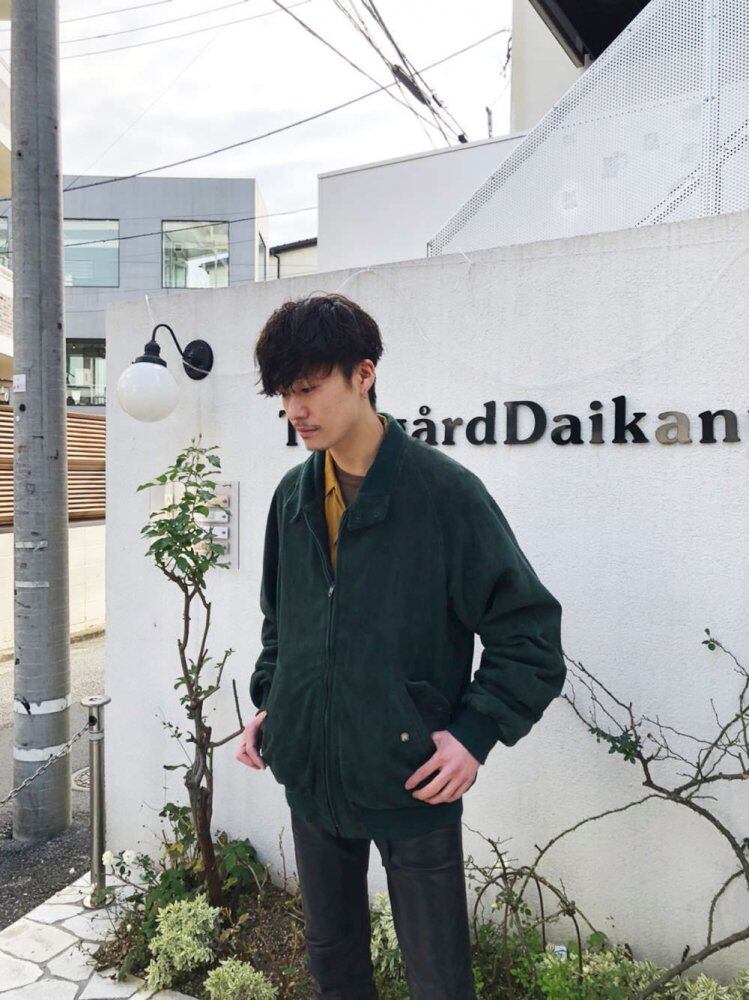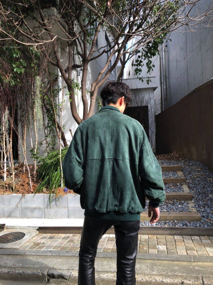 90s suede jacket A very nice atmosphere with a deep green hue. It is a good silhouette with a moderately spacious size. A vintage jacket with a smooth suede texture.