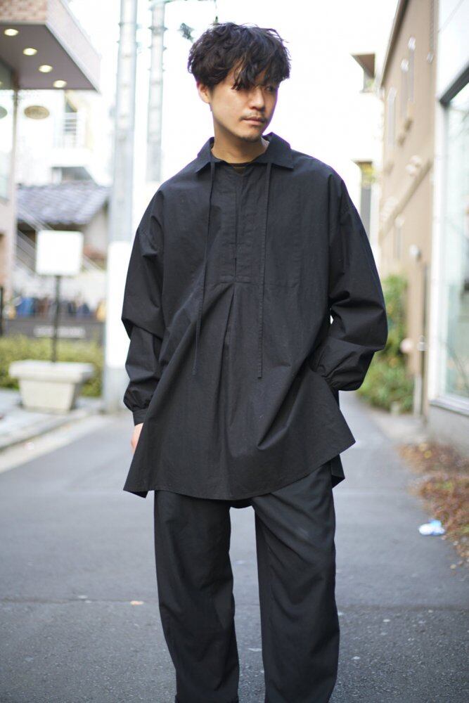 [ALVISTA] 4th issue Vol 1. Based on the shirt that was worn by the Swedish Armys Red Cross unit Red Cross in the 1920s and 1930s. By adjusting the amount of fabric for each part with tack and gather in a large size design as a whole, a strong and weak constructive form is formed. There are left and right pockets on the chest that use the front opening. The straight one-piece collar cord is a quote from old marine wear, and can be hung as it is or tied around the neck for an accent. Product one wash finish. The button is a real shell button that uses Takase shellfish and black butterfly shellfish.