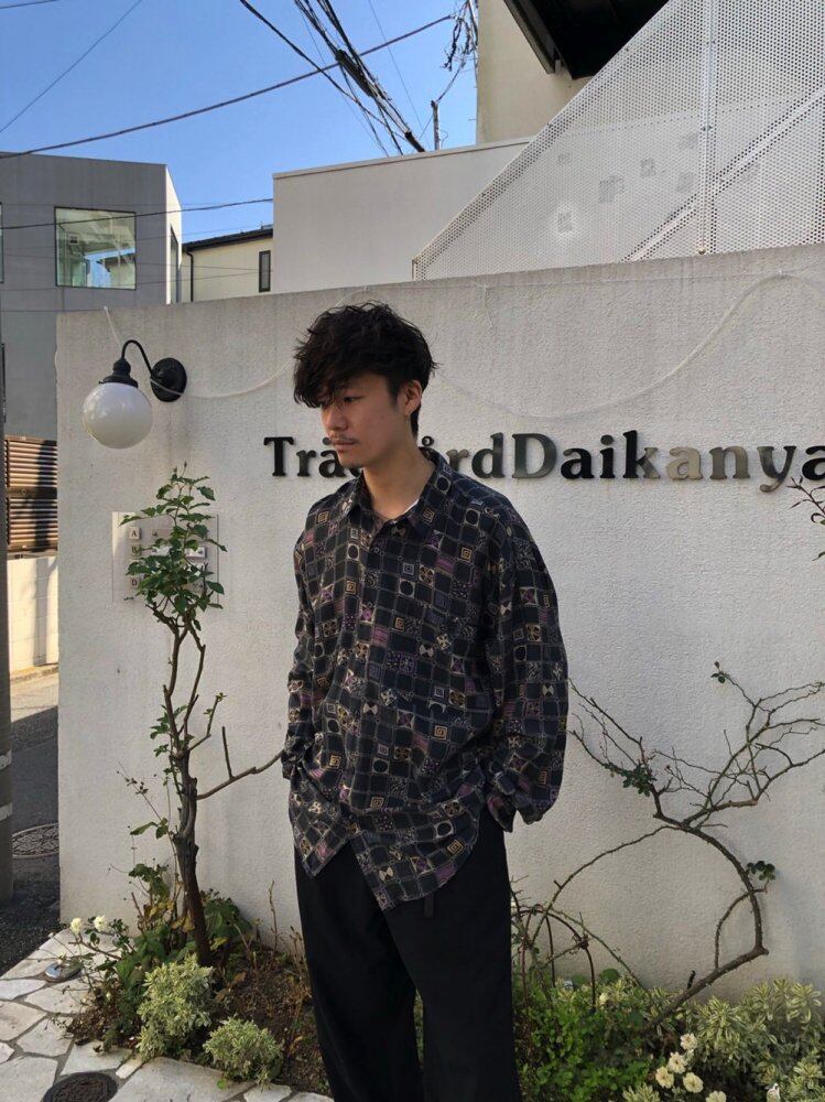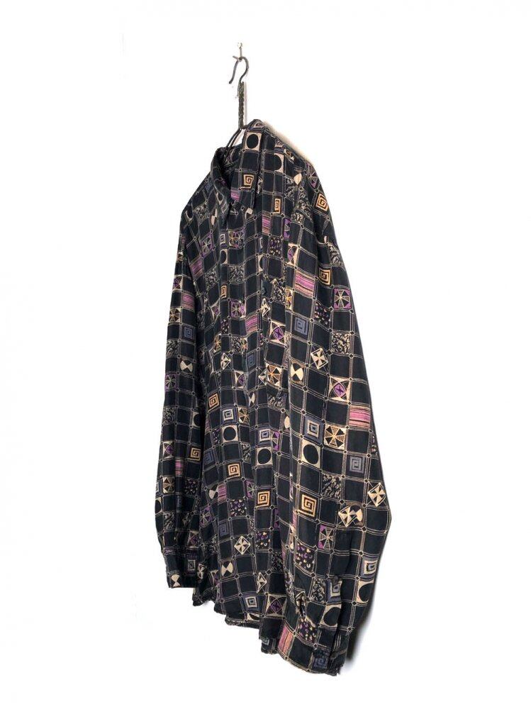 90s silk shirt A vintage shirt made of 100% silk with a soft, light and smooth feel. Black, beige and purple monogram patterns are one of the artistic atmospheres. A relaxed over-silhouette shirt with a moderate volume.
