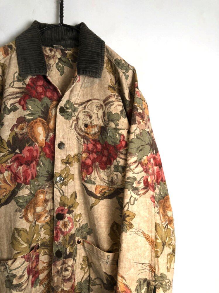 80s coverall jacket with botanical pattern printed in a calm beige color. A feminine pattern gap is interesting for a work style jacket. 1 100% cotton material with a moderate thickness suitable for spring haori. A feeling of size, a good silhouette first place