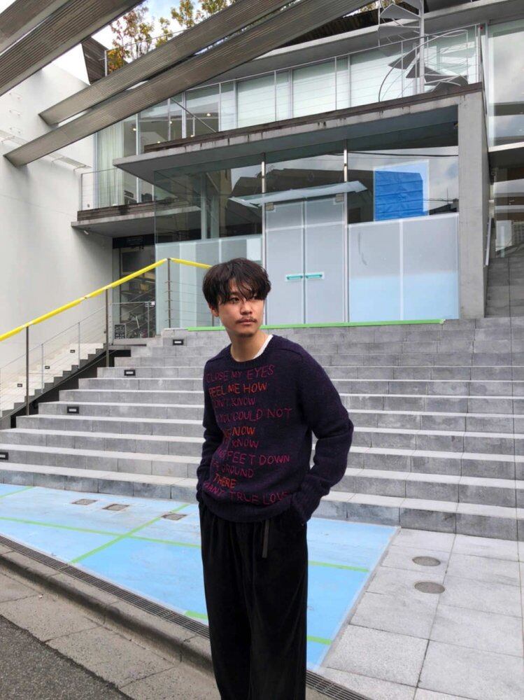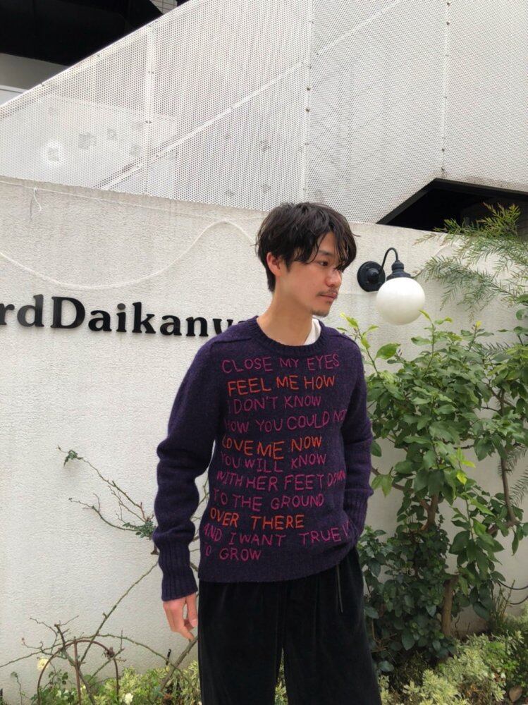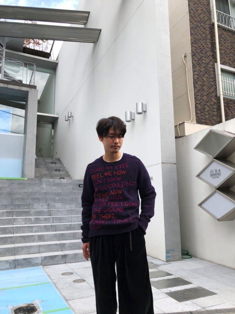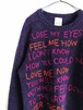 A remake of a vintage crew neck knit with all the lyrics of the musicians who influenced him by hand embroidery.