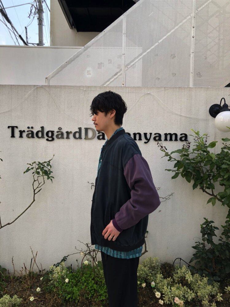 The 90s silk jacket has a black body, purple sleeves, and a playful bicolor.
