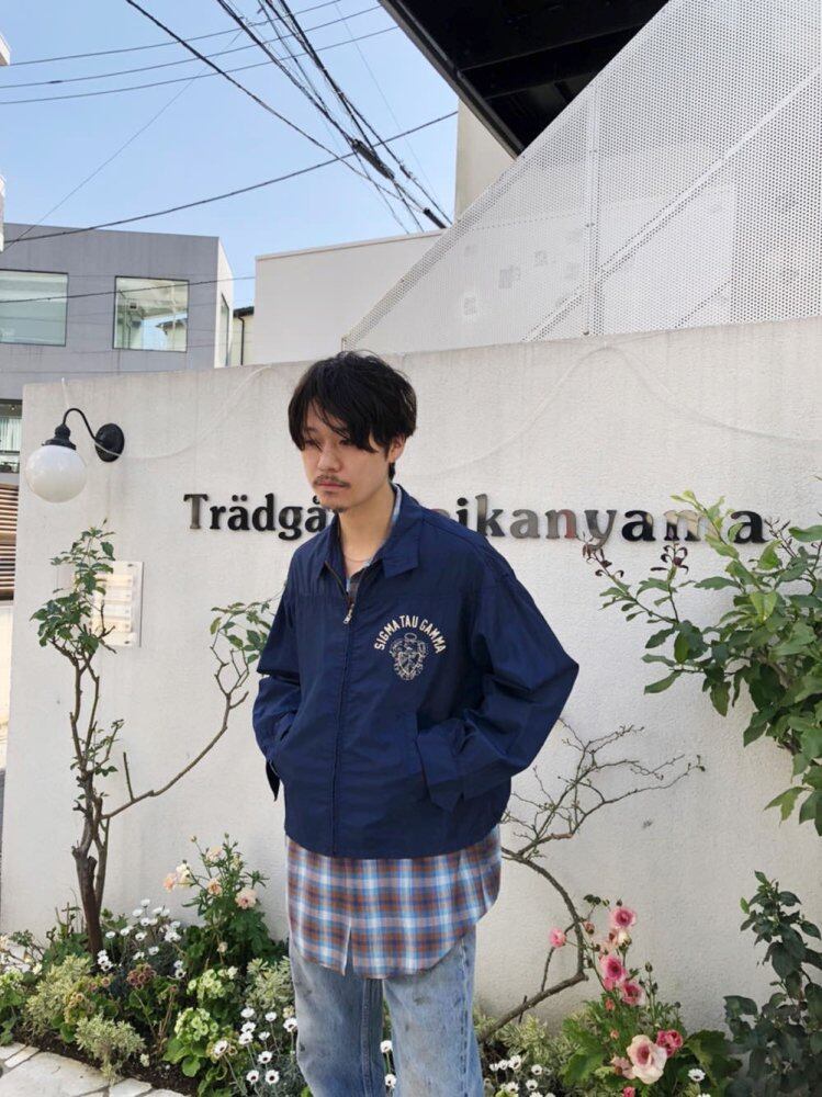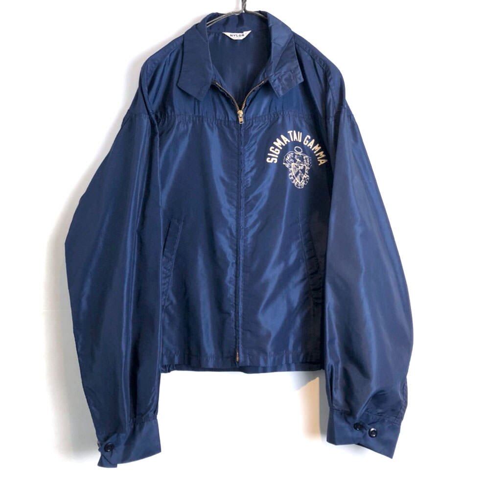 Nylon jacket from the 70s A jacket made from a single piece of light nylon fabric that can be worn like a shirt. A short length A-line silhouette with a distinctive layered look. The emblem printed on the deep navy chest is also an atmosphere. Is a good jacket