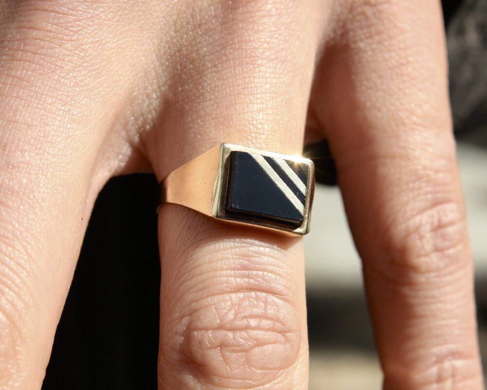 British made signet ring. It is the only ring that is allowed to be worn among British gentlemen who wear good things that can be used for a long time with as little waste as possible. The rectangular top has onyx and diagonal lines, giving it a solid feel that is typical of this age. It is a ring with a minimalist impression that you can not easily find if you look for things like onyx in good condition. 375-9ct gold engraved, 1986 London office hallmark. Please check the condition in the photo and purchase after acknowledging the characteristics of vinteg.