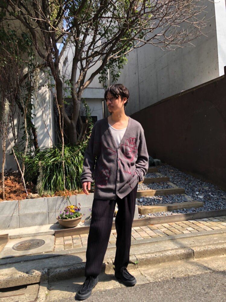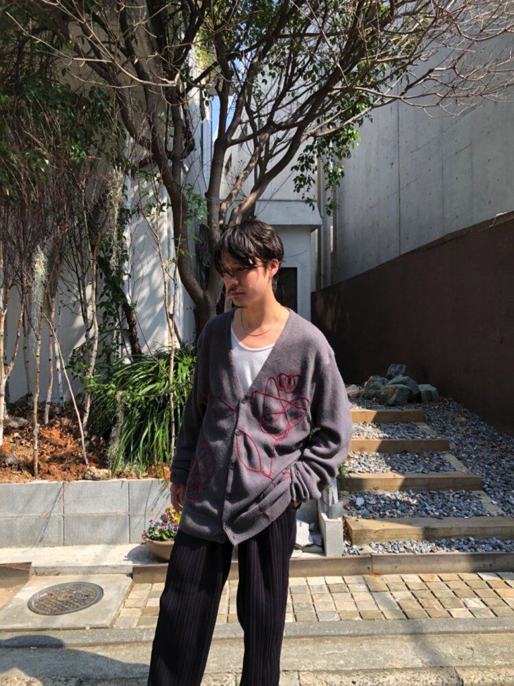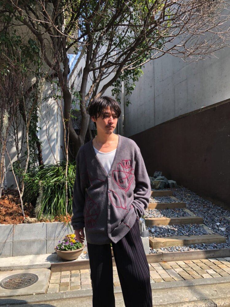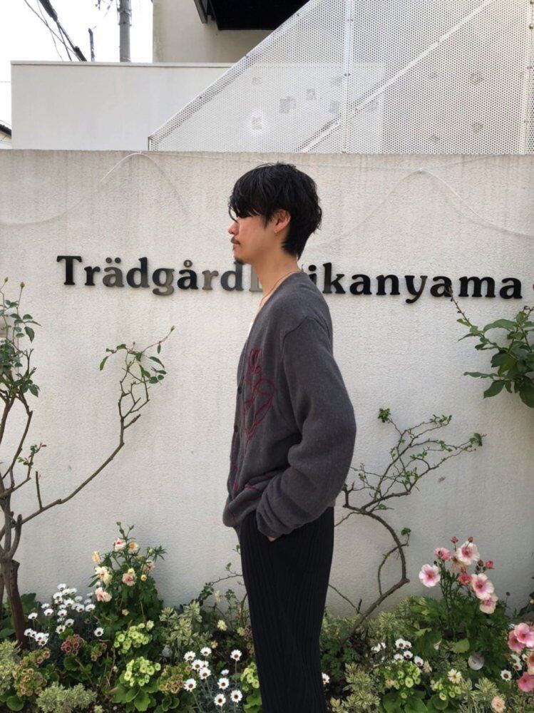 The bold rose embroidery based on the vintage acrylic knit cardigan gives an elegant look.