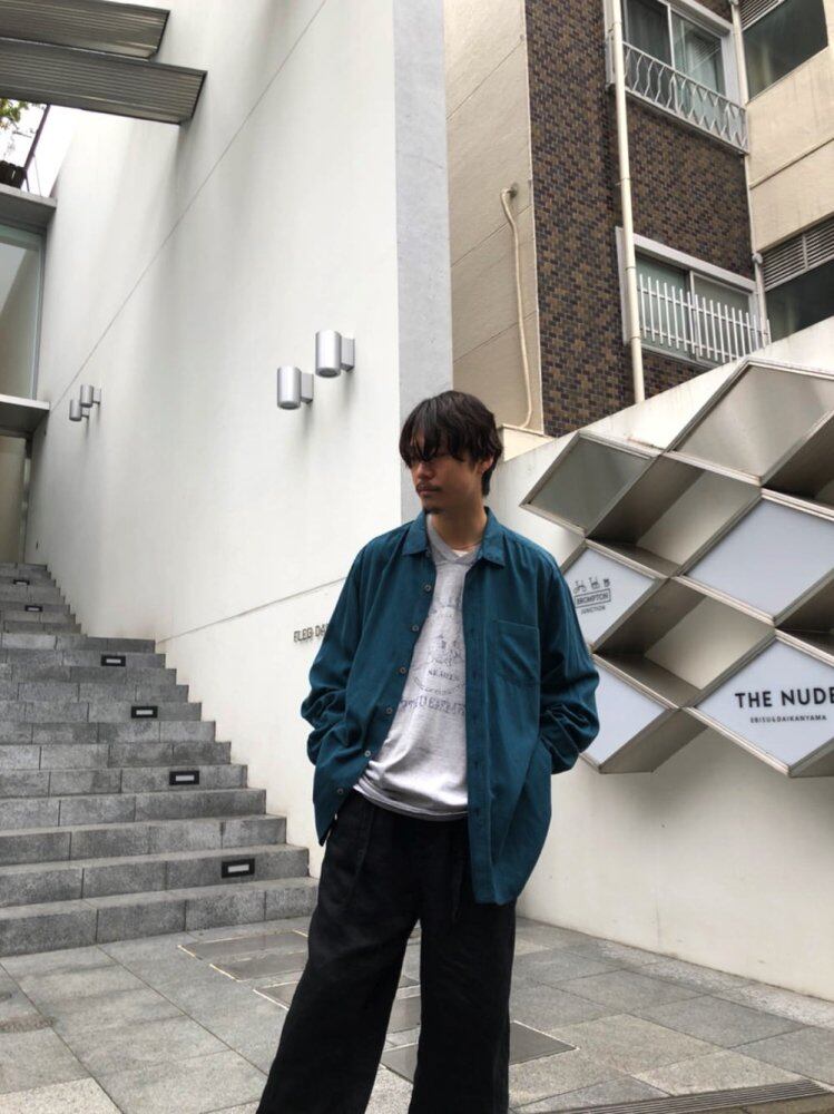 90s long-sleeved shirt Tencel x cotton glossy satin fabric with a deep blue-green color that has a nice atmosphere. It feels like silk or rayon.
