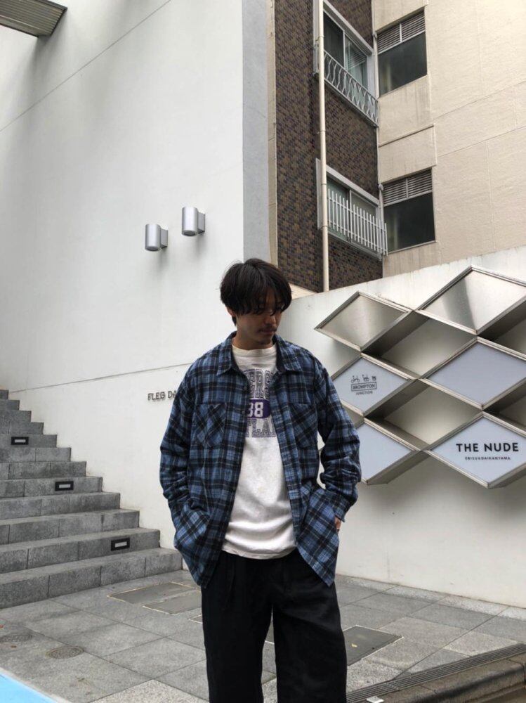 XL size loose volumey over-silhouette is the first place with a nice atmosphere. Sax blue x black checkered pattern with a cool impression.
