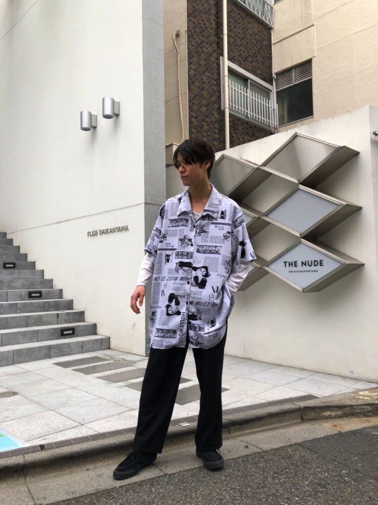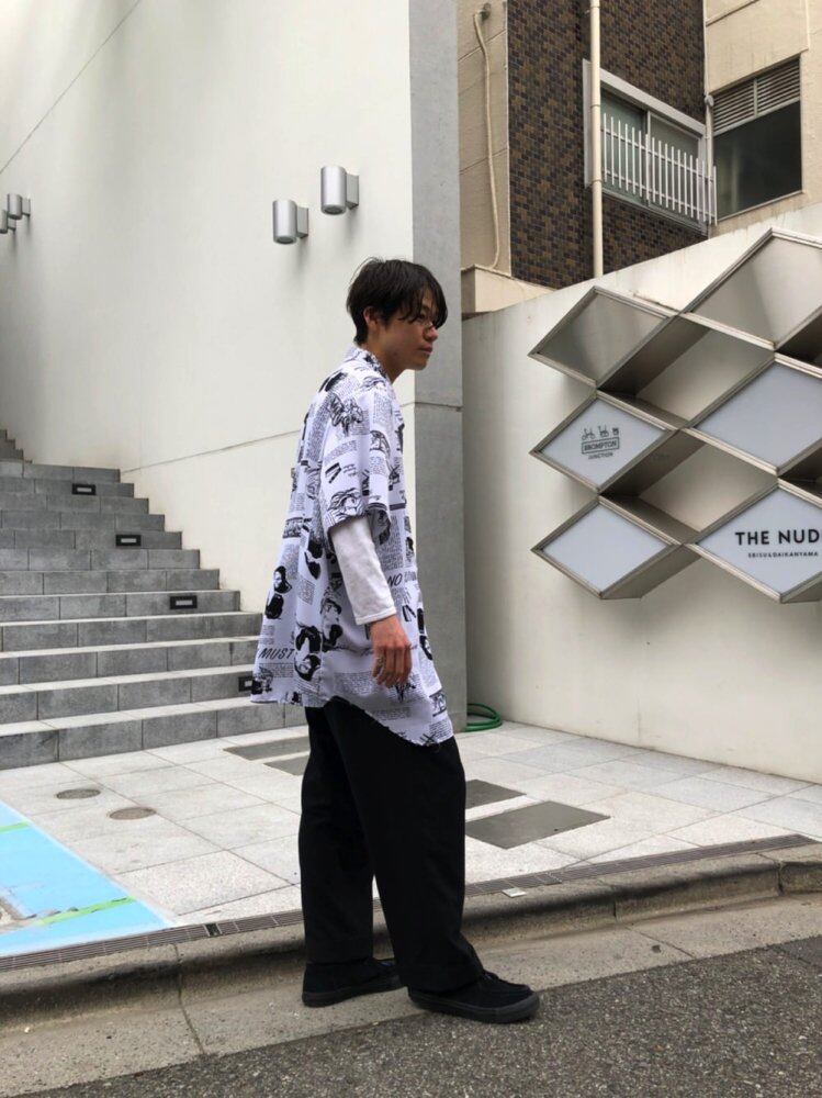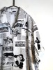 A 5XL size loose over-silhouette with an impactful 80s English print. A vintage short-sleeved shirt that wont lose volume even in light spring / summer outfits.