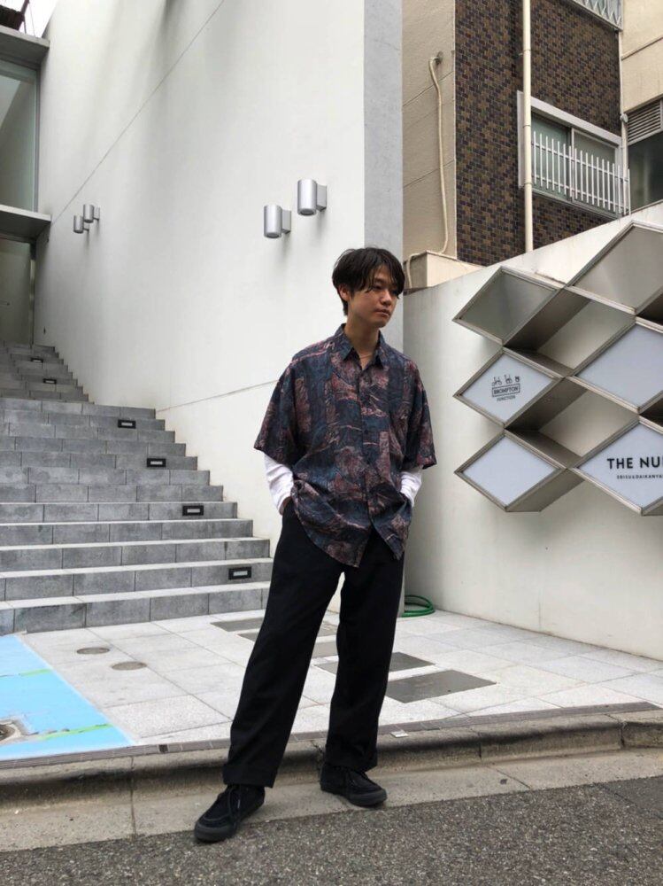 90s short sleeve silk shirt The abstract pattern based on blue gray x pink is a very nice piece of clothing. A relaxing silhouette with just the right amount of space.