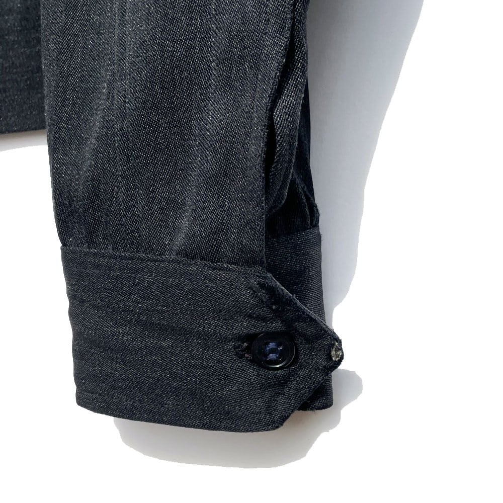 This is made of a robust rayon-blended gabardine fabric, which gives off a profound atmosphere with its rare black color and retro emblem in vintage.